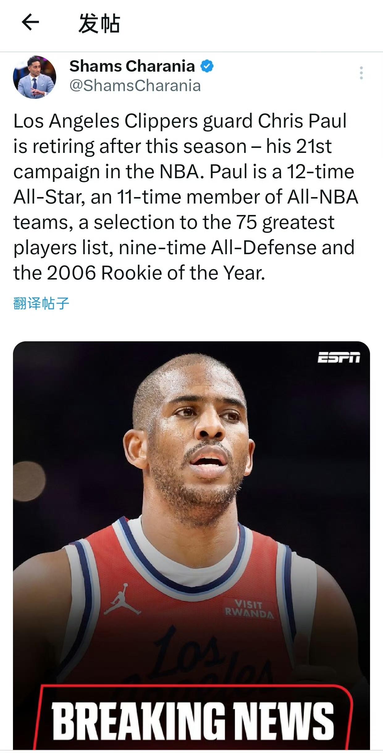 保罗宣布本赛季结束后退役!詹姆斯送祝福——控卫之神。 确实也该退了,本赛季在快船作用很小了,即使不退其他队也不会给合同。 回到空接之城退役也算圆满了! 21个赛季:12次全明星,6次抢断王,5次助攻王,11次最佳阵容,75大球星,9次最佳防守阵容,06最佳新秀。 取得的个人荣誉挺多的,可惜没有MVP和总冠军。