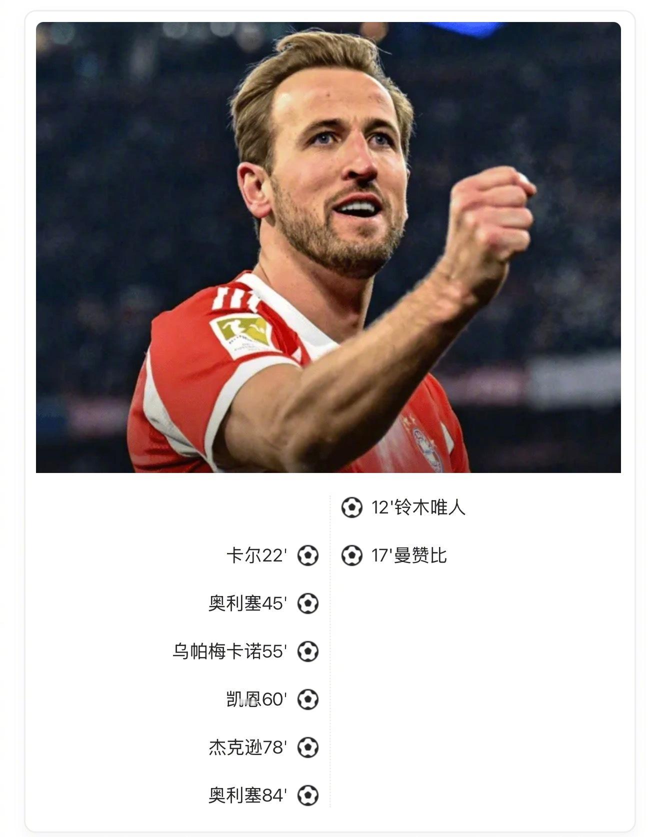 【战报:,卡尔传射,奥利塞两球三助】上半场弗赖堡的铃木唯人、曼赞比连入两球,随后卡尔和奥利塞连扳两球,下半场于帕梅卡诺、凯恩、杰克逊、奥利塞破门。