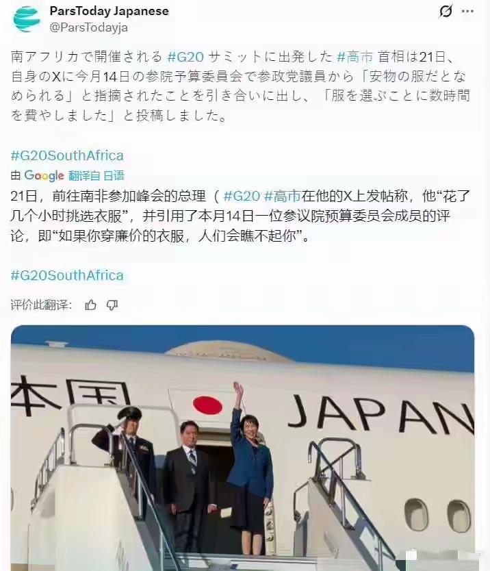 高市早苗竟然在G20迟到了,她自己的解释是花了几个小时挑选衣服。从她步入会场的这身着装来看,她应该是费了不少心思的,毕竟看起来就像一个公司的副总,挺干练的。但是,她挑选衣服花了几个小时,是日方的会议组织者没有提醒她,还是提醒了却没被高市听进去,似乎很有玄机啊!
