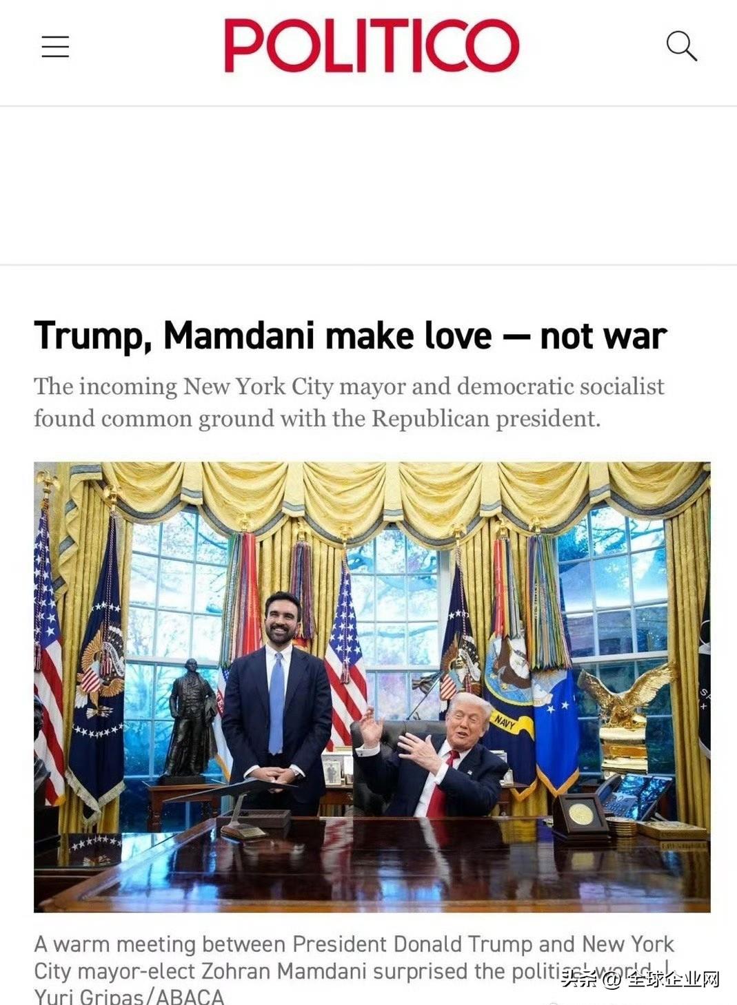 特朗普和马姆达尼的会面结果几乎使全美媒体震惊。 右翼的NYP仍然暗戳戳的提醒“川皇”马姆达尼此前对他不敬:《Trump jokes it’s OK for Mamdani to call him a ‘fascist’: ‘You can just say yes’》 偏左的《POLTICO》直接惊的大喊《Trump, Mamdani make love - not war》 美国政治真的越来越有意思了[允悲]