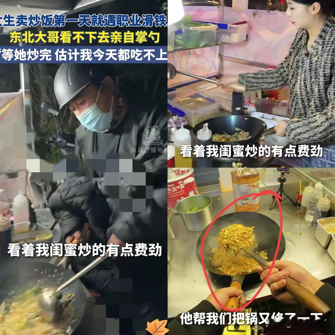四川一女生和闺蜜卖炒饭,不料,一位东北大哥竟然嫌闺蜜炒得慢,直接自己上手:“等她炒完,估计我今天都吃不上” 第一天出摊就被东北大哥“上了一课”, 小唐和闺蜜凑钱买了二手厨具,在家练了两三回就敢校门口摆阵! 结果掌勺闺蜜一紧张直接翻车——火不敢开太大,颠勺跟绑了铅块似的,炒个饭磨磨蹭蹭! 东北大哥点单后站旁边瞅两分钟,急得搓手:“妹子你这速度,等你炒完我今儿怕是得在这儿过夜!” 没等姑娘应声,大哥直接撸起袖子夺过锅铲,大火猛开,抓米下锅手腕一翻,米饭“哗啦”散开,磕蛋撒料一气呵成,颠勺带起的火星子看得俩妹子直咋舌! 三分钟不到,一份金黄焦香的炒饭就端上桌,临走还顺手把她们吱呀作响的破锅修得锃亮! 这哪是来吃炒饭的,分明是隐藏的厨神下凡救场!东北人的热心肠真不是吹的,嫌慢不逼逼,直接上手解决问题,连售后都给包圆了,这格局直接拉满!