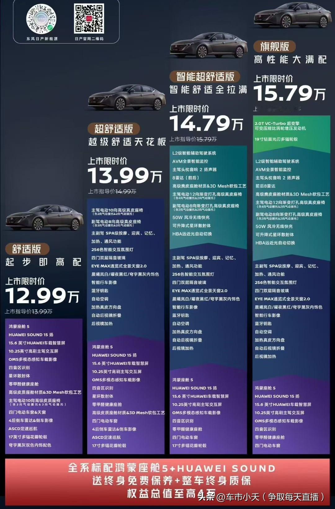 新款天籁也开始搭载鸿蒙座舱,售价12.99万~15.79万。天籁是东风日产目前为数不多销量尚可的车型,价格也是一降再降。它的老款车型目前普遍降价幅度都在65000以上,所以它的新款定价比老款降很多,算是比较理性的定价。 天籁包括很多传统燃油车都面临一个问题,就是没有什么新的卖点。以前说发动机、变速箱等,现在消费者似乎不再过多关注这些。所以现在燃油车基本都是靠降价换销量,品牌附加值带来的收益正在降低。
