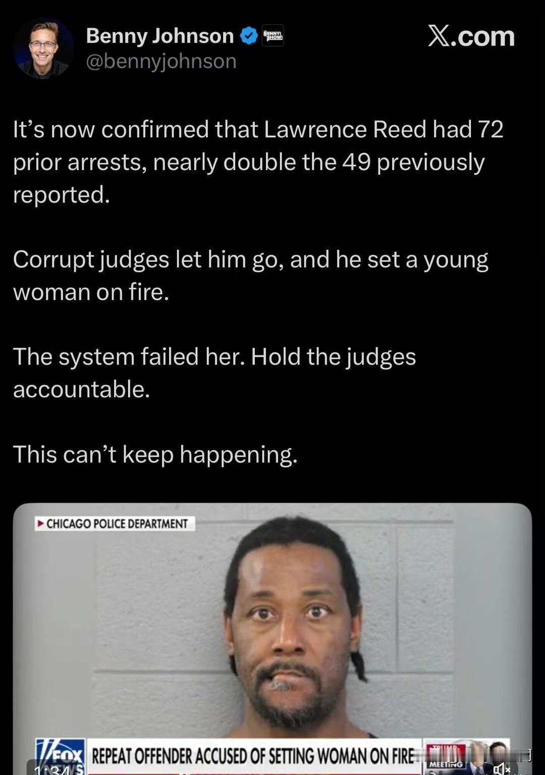 芝加哥一个黑人在火车上点火烧一个白人女性。这家伙已经被抓捕七十二次,犯罪被抓然后释放,再犯罪被抓,然后释放,就这样循环。民主党治理下的地区,犯罪分子尤其是黑人有特权。
