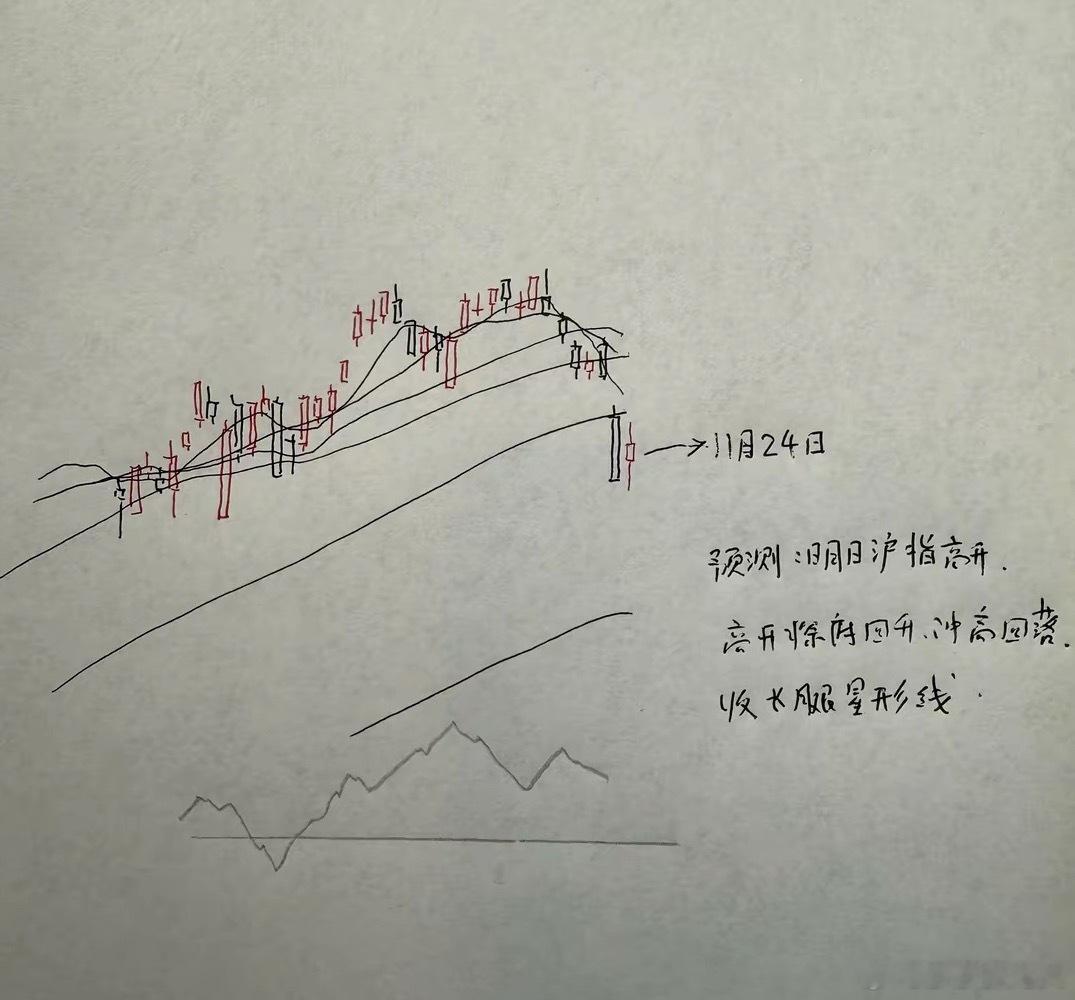 明天A股怎么走?莎莎做了一个大胆的预判,莎莎有三个具体理由,大家来听听的观点第一,从图一周五的分时图来看,市场指数在早盘下跌到3841点附近之后,市场指数出现了分时级别的小双底结构。并且午后产生了一轮相对明显的反弹。上证指数的跌幅一度缩窄至1.4%以内。虽然随后又出现了一轮新的杀跌动能,市场指数最低点到达3834点(市场指数杀跌到星期五早上我在早评文章当中和大家讲到的3835点的止跌位置)。但是莎莎认为这只是为了进一步夯实分时级别小双底的走势。在更宽一点的分时位置,再次确认3834点附近的支撑。第二,本次星期五的大幅调整,与星期四晚上美股的大幅调整有很大的关联。美股本周四晚上出现了大幅度的下跌,纳斯达克指数的跌幅超过2.1%。所以导致了A股隔天的大幅低开,并且走低。而周五晚上我们看到美股三大指数都出现了较明显的反弹。那么这对于A股来说,短线也有情绪上的助推作用,有利于A股在下周星期一产生反弹动作。第三,各大指数都已经跌到了明显的支撑位。比如说上证指数跌到了10月17号的低点3835点附近。创业板指跌到了日线级别,10月15号的低点附近。深圳成指跌到了20周均线的支撑位附近。代表小盘个股走势的中证2000指数跌到了日线级别前期低点附近。各大指数都到达重要的支撑位,意味着止跌反弹发生的可能性大大增加。所以综合以上分析,对于明天市场走势,莎莎的判断是明天或者会走出一颗高开震荡的螺旋桨k线。那么明天A股到底怎么走?大家请看图二关于明天走势莎莎手绘的预测图对于市场走势的分析,我多半从纯粹的技术面出发。对于消息面和基本面的分析则相对较少,所以我的观点不一定正确,仅代表个人见解,不代表任何投资建议。最后莎莎还想给大家补充一点的是,本轮自4034点下跌以来,一直到本周星期五的调整,莎莎都给大家提前判断到了。但是直至星期五,这一次大幅下跌,很多朋友才开始相信市场真的会跌了。才开始注意到莎莎以前和大家提到的上证指数已经走出了日线级别完整的五浪结构,并且在第5浪的时候出现了衰竭楔形的特征,并且日线级别出现了非常明显的量能顶背离,指标顶背离。所有这些回过头来看,很多朋友之所以没有意识到市场会下跌,完全是因为前期连续上涨所带来的思维惯性,或者说线性思维。这一次的调整可以说又是非常生动的一堂课。大家点赞,评论,加关注就是对莎莎这个纯技术派的最大支持。