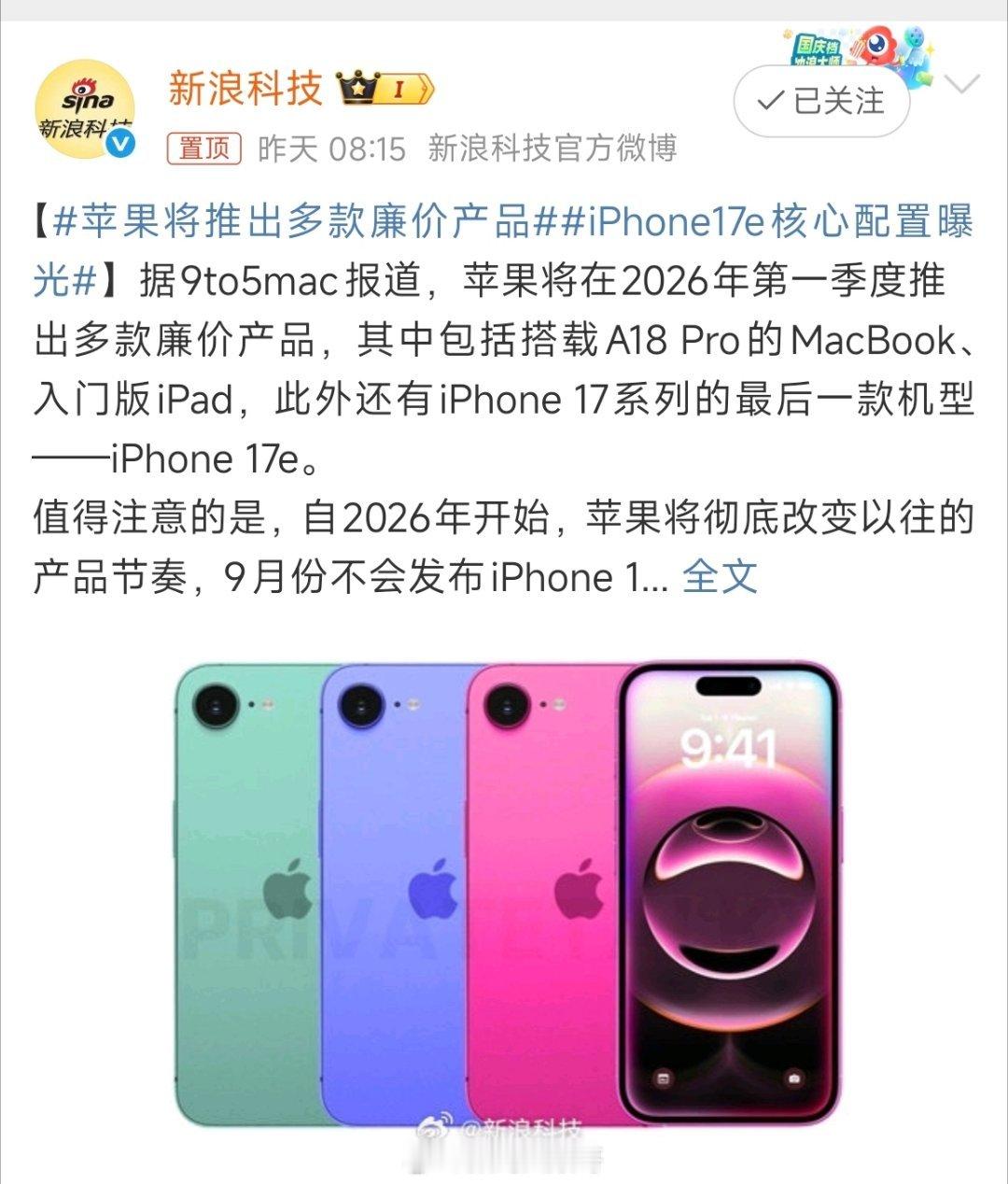 据爆料苹果2026年将推多款廉价产品,iPhone 17e搭载A19芯片与灵动岛,但仍是60Hz屏。同时苹果调整节奏,未来标准版iPhone将移至年初发布。对此,你怎么看?