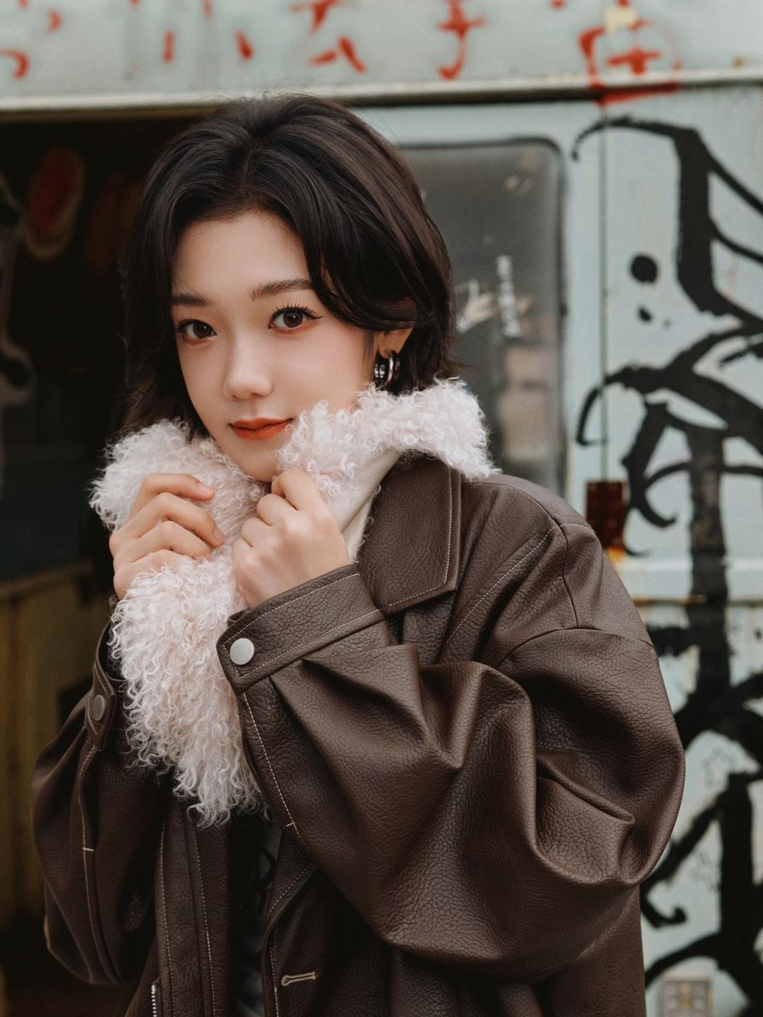 希林娜依高的美拉德风杀疯了!棕色皮衣+毛绒领=又酷又暖的秋日女王