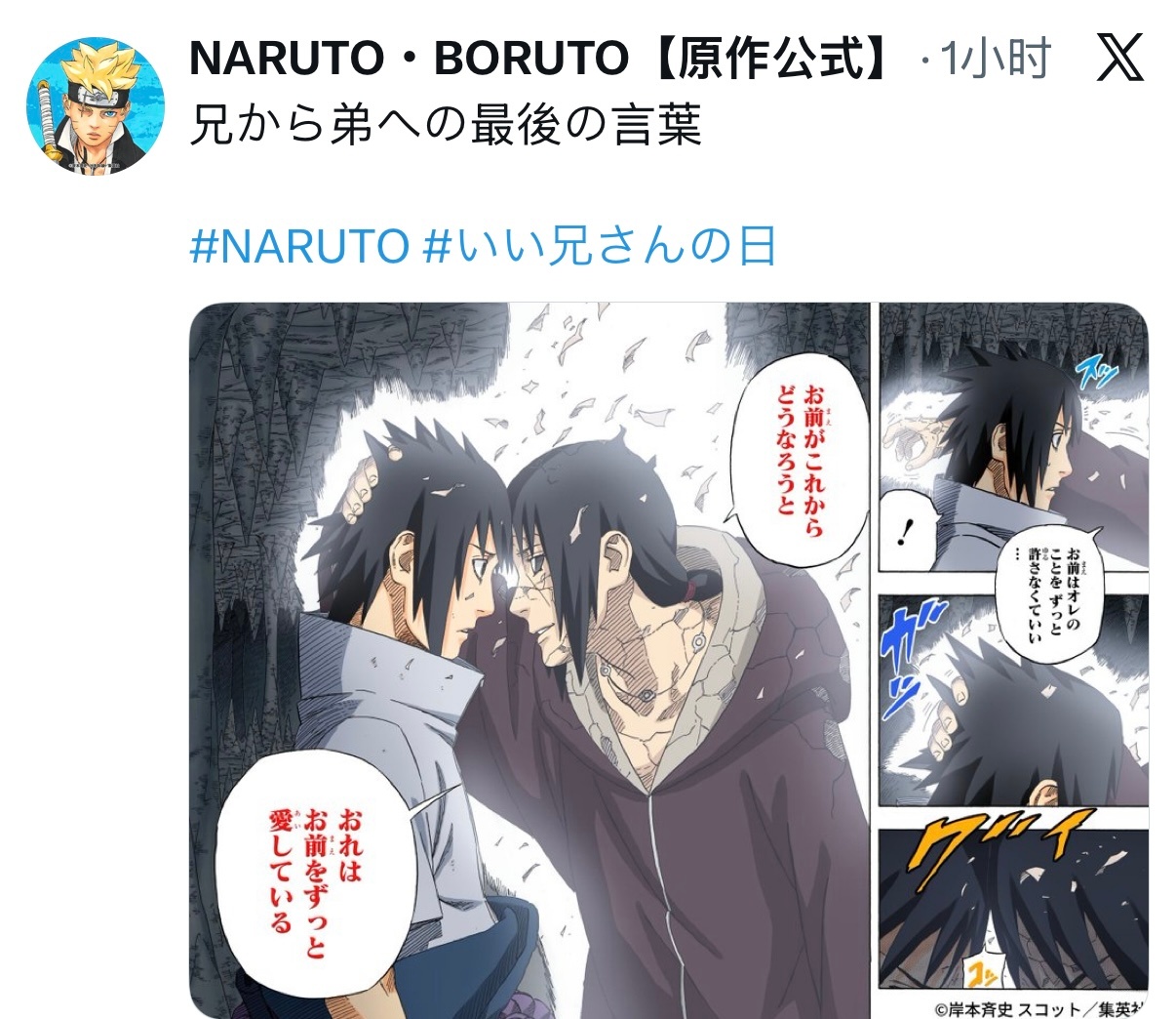 【火影忍者官方最新发布了推文】哥哥对弟弟最后的遗言。“无论你将来变成什么样 我都会一直爱着你!”