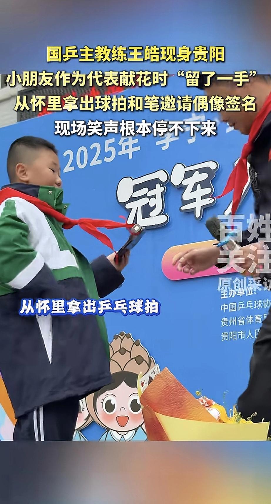 这孩子真是个小机灵鬼! 王皓教练来贵阳,小朋友作为代表献花。谁都没想到,他献完花不慌不忙地从怀里掏出了早就准备好的球拍和笔,请偶像签名。这一连串操作把全场都逗乐了。 都说机会留给有准备的人,这孩子完美诠释了这句话。别的孩子可能光顾着激动,他却连签名工具都提前揣好了。这份超出年龄的沉稳和机智,将来准能干大事。 从这件小事就能看出,成功真的不是偶然。哪怕是个孩子,懂得把握机会、提前准备,就能创造属于自己的精彩瞬间。这份胆识和心思,值得很多大人学习呢!