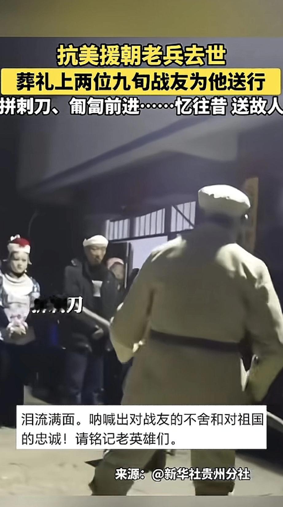 看到这送别的一幕,眼泪止不住地流。 一位抗美援朝的老兵走了,两位九十多岁的战友来送他最后一程。他们展示拼刺刀、匍匐前进回忆着当年一起在战场上拼刺刀、匍匐前进的岁月,用尽全身力气喊出对战友的不舍。 这声呐喊里,装着的是生死与共的战友情,更是他们对祖国赤诚的心。当年正是这些年轻人,用血肉之躯换来了我们今天的太平日子。 如今英雄渐次凋零,但他们的故事不该被遗忘。让我们记住这些最可爱的人——他们吃过我们没吃过的苦,才有了我们今天甜美的生活。老英雄,一路走好!这盛世,如您所愿。