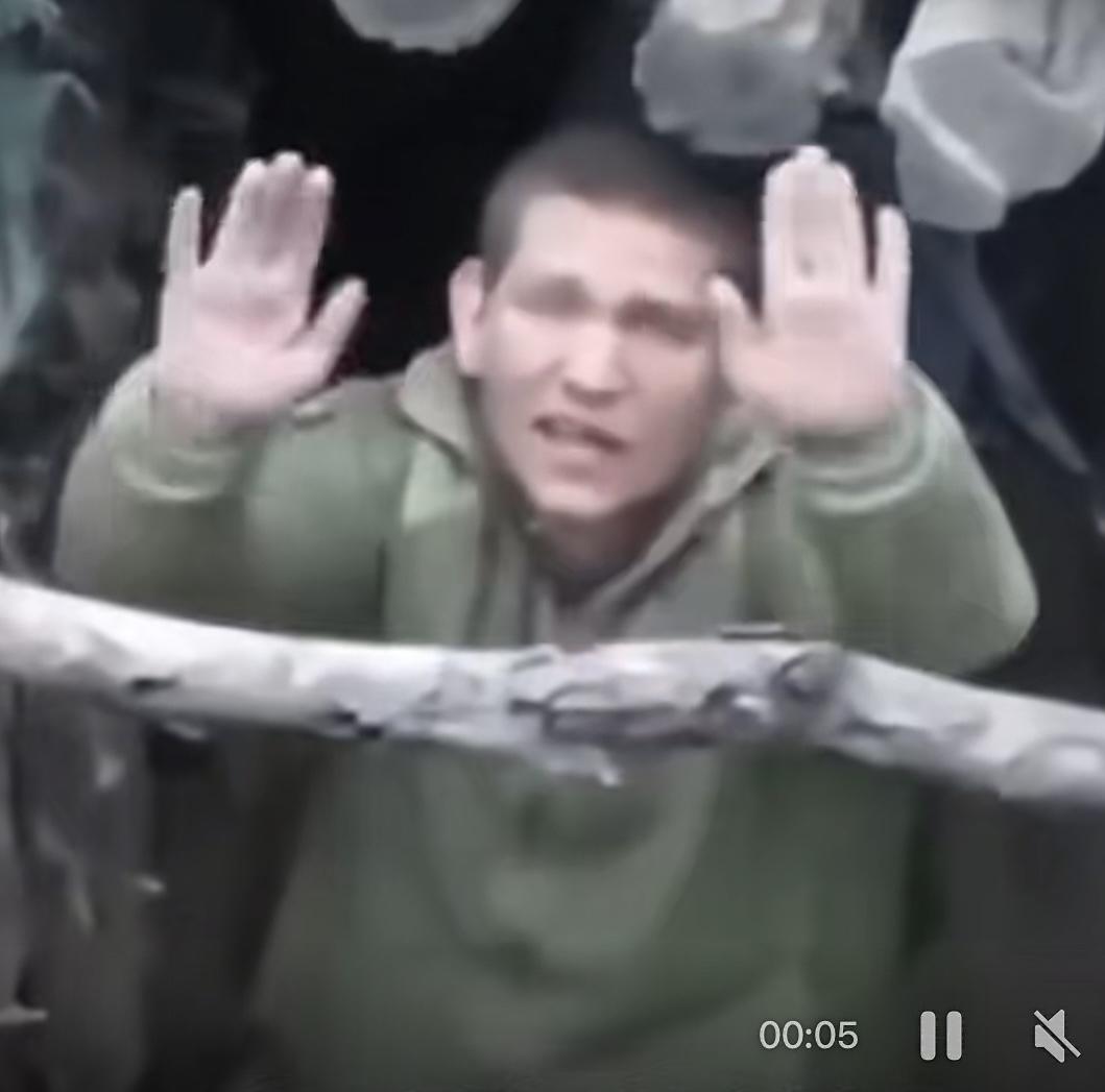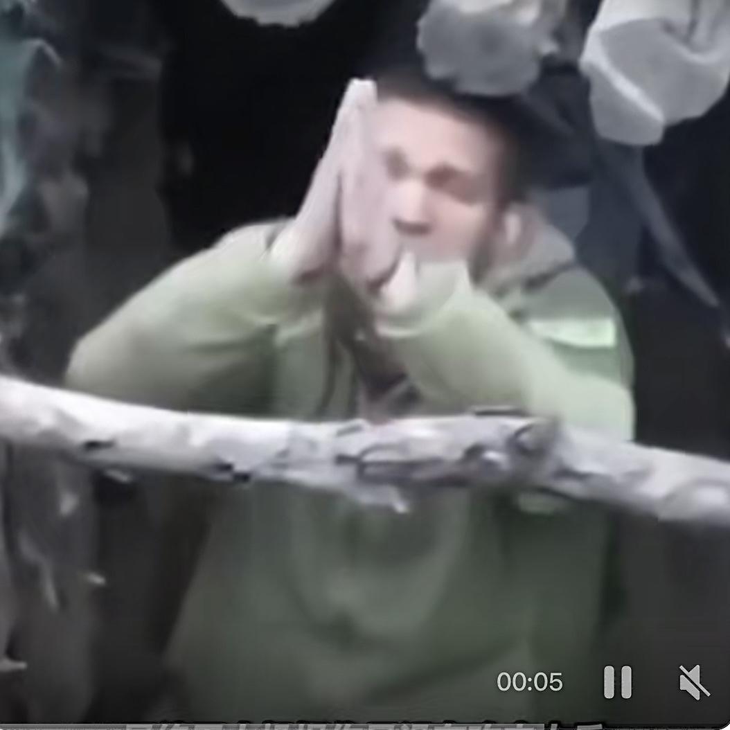 这是一名乌克兰士兵向俄军无人机投降的画面。该士兵从掩体探出身子,双手合十跪地求饶