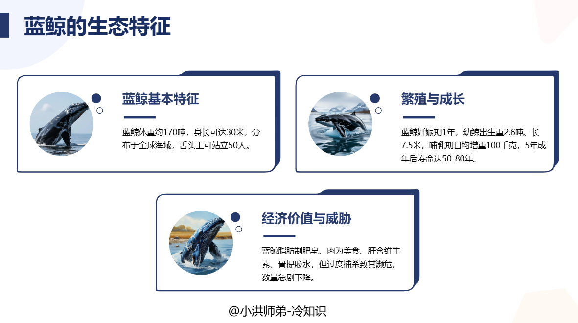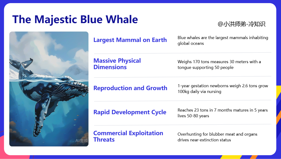 最大的哺乳动物世界上最大的哺乳动物是蓝鲸,这种动物分布于世界各海域。它体重约170吨,身长可达30米左右。蓝鲸的头非常大,舌头上能站50个人。蓝鲸经过1年左右的妊娠期后,小蓝鲸一般在冬季从母体中分娩出来。刚出生的幼鲸就重达2.6吨,长7.5米。小幼鲸体重的增长速度非常快,一般在母亲喂奶后24小时,它的体重就能增加约100千克,平均每分钟增加约70克。幼鲸在长到7个月时,其体重可达23吨左右,身长有16米,并开始学着张嘴吞食各种浮游生物。小蓝鲸经过5年的成长就成年了。成年蓝鲸一般能生存50~80年。浑身是宝的蓝鲸用途广泛,其脂肪可制造肥皂;鲸肉可被制作成味道可口、富有营养的美食;鲸肝含有大量维生素;鲸骨可提炼胶水;鲸血和内脏器官又能制成优质肥料。因此,人类常常肆意捕杀蓝鲸,以此牟利。这导致了蓝鲸的数量急剧下降,目前蓝鲸已成为世界上濒临灭绝的哺乳动物之一。||
