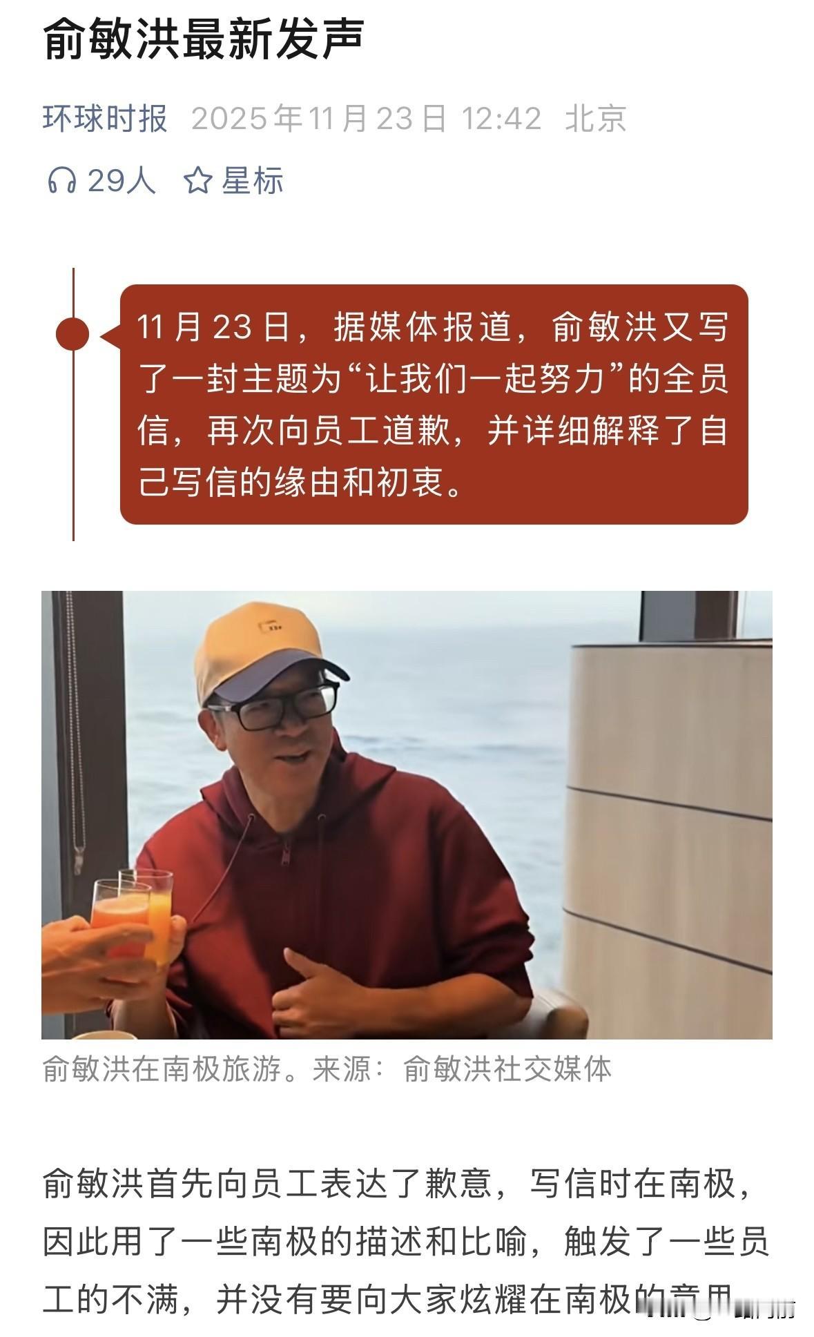 俞敏洪最新发声 “南极风波”终于有了最新进展!继内部信引发员工吐槽“你在南极看企鹅,我在工位当牛马”后,他再发长文回应,道歉、解释、亮态度全安排上了,网友看完直接吵翻! 先把来龙去脉捋清楚:新东方32周年时,俞敏洪在南极发了封内部信,5次提南极、17次说“我”,还通篇用了红色字体,直接戳中了不少熬夜加班的员工。大家吐槽老板只顾着旅游炫耀,完全不顾员工压力,甚至有人说他“用员工的血汗钱游南极”,争议越闹越大。 这次俞敏洪直接正面回应,态度可以说很诚恳了: 1. 先为南极描述和红色字体道歉:说在南极写信只是想真诚分享,没半点炫耀的意思,还说“愿意分享的老板总比神秘的强”;红色字体则是因为老一代人有红色情结,觉得喜庆,没别的坏心思。 2. 反驳“血汗钱旅游”:直言这话不妥,员工努力工作的同时,老板也在拼命扛风险,公司和员工是互相成就的双向选择,不是单方面的付出。 3. 解释南极之行的目的:承认有个人旅游的成分,但核心是工作——受奚志农老师邀请,探讨青少年自然探索教育,还在当地挖到了几位自然教育专家,未来可能加入新东方。 4. 回应熬夜争议:直言“我熬夜的时间不比员工少,只是工作内容不同”,还承诺员工受委屈可以内部反馈,甚至能直接给他发邮件。 更实在的是,俞敏洪还甩出了福利:明年冬天要选10名优秀基层员工去南极,让大家也能感受极地风光,这波“有福同享”的操作确实拉了不少好感。 说实话,这波回应看得出来俞敏洪是真的想解决问题。老板和员工的立场不同,员工吐槽“共情不了”能理解——自己熬夜备课、扛KPI,老板却在南极看冰川,心理落差肯定大;但俞敏洪说的“互相成就”也有道理,老板要扛公司运营的风险,拓展业务、招揽人才也是为了给员工提供更稳定的平台。 不过争议点也还在:有人觉得道歉很真诚,解释也合情合理,还送南极名额,态度够好;也有人觉得“工作旅游”的说法有点牵强,员工要的不是远方福利,而是当下的理解和关怀。 而且之前俞敏洪还澄清过南极旅行费用,说坐的邮轮价格20-25万,不是外界传的148万,还允许员工吐槽,说这是新东方的传统,这份包容度其实也挺难得。