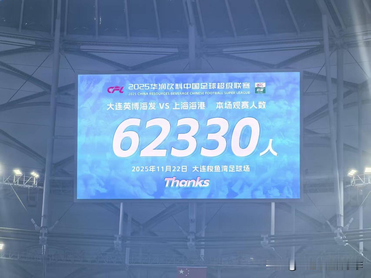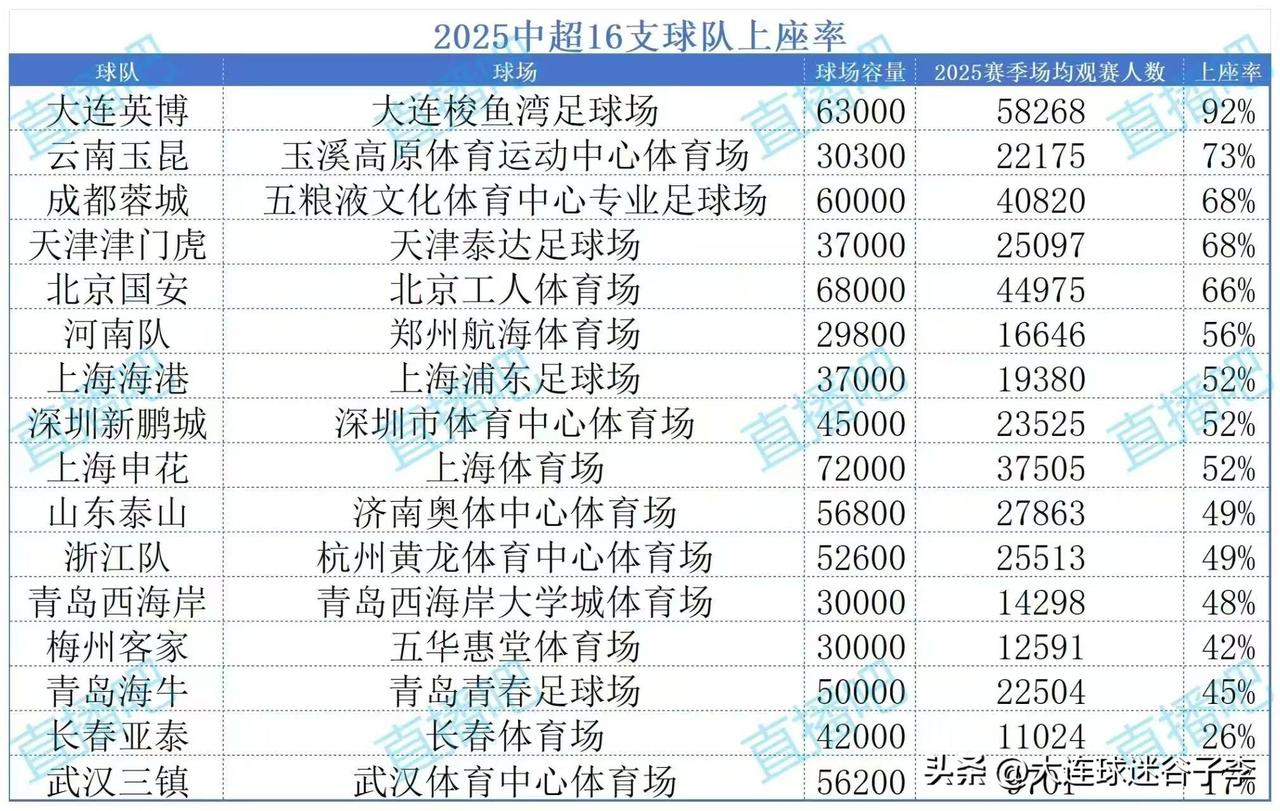 中超第一主场,大连梭鱼湾足球场,2025赛季联赛15场+足协杯1场,16个主场比赛的总观赛人数934048人,中超第一! 单从联赛来看有6.3万个座位的大连梭鱼湾足球场上座率达到了92%,场均58268人,基本上是一票难求。 15个主场的中超联赛,梭鱼湾总观赛人数为874020人,比第二名北京国安的主场北京工人体育场多出199393人,而最后一名的武汉三镇主场仅有148207人。199393人比梅州客家、长春亚泰和武汉三镇的主场人数都多。 武汉三镇成绩不好,梅州客家和长春亚泰降级了,这三支球队主场人数不多也能理解。而和武汉三镇同积25分倒数第三的青岛海牛队的主场人数却排在第9位,有337567人,可见海牛球迷是多么的热爱足球热爱自己的球队!
