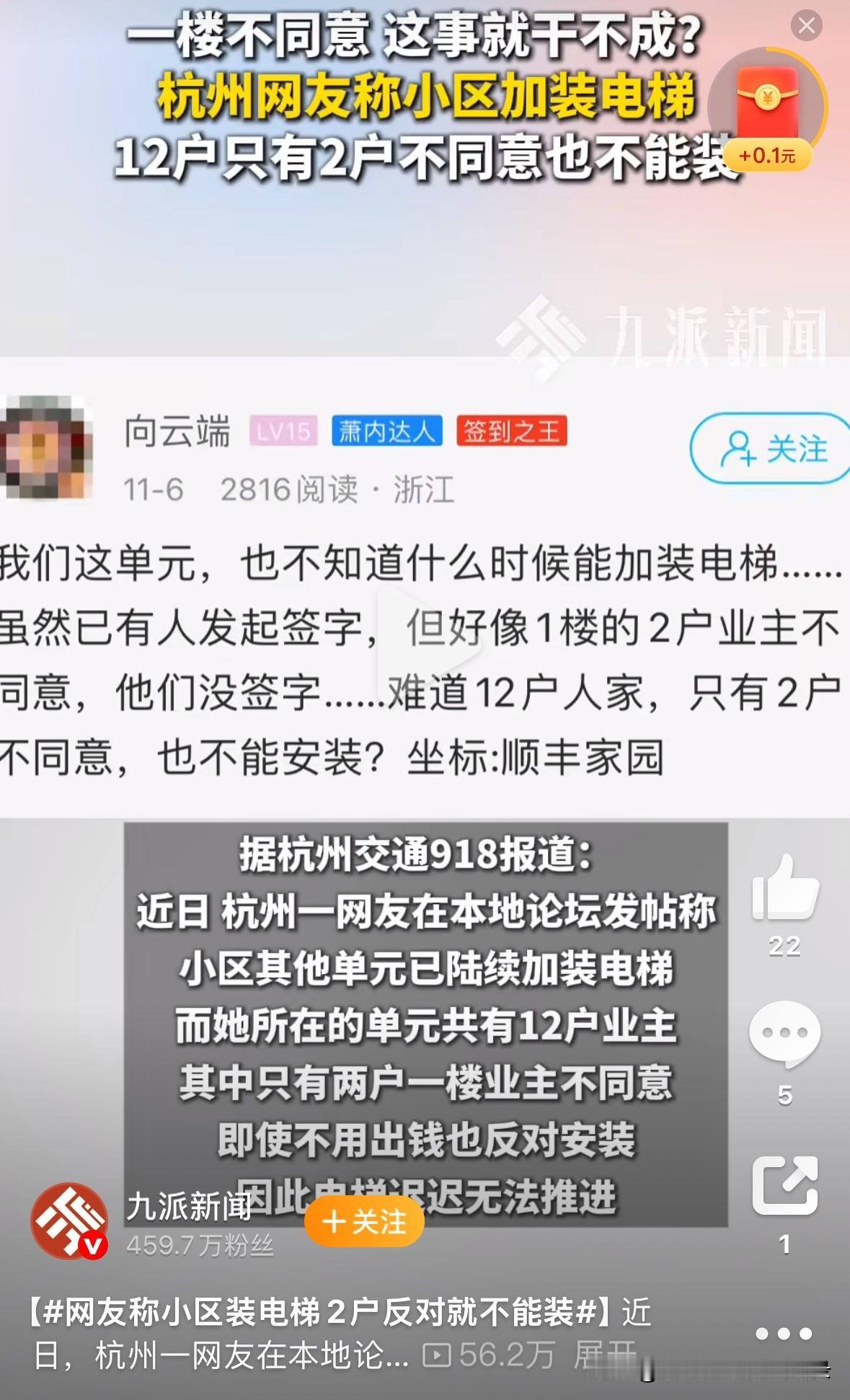 近日,杭州一女子发帖称,小区其他单元楼都已加装电梯,只有她所在的单元,12户业主只有2户一楼的业主不同意,他们也表示不需要一楼出钱,但是对方仍不同意,导致目前她所在的单元楼无法安装电梯。 其实,老小区加装电梯,经常能遇到一楼业主反对的情况,这是一个非常现实的问题。 因为老小区1楼,2楼本来相对5楼,6楼的优势也就是不用爬楼梯,加装电梯从经济的角度来说收益最大的就是高楼层,而低楼层全是影响,比如噪音问题,隐私问题,更主要的现实问题是: 如果你是买房的,有了电梯之后你必然会考虑高楼层的,装了电梯必然导致高楼层涨价,低楼层房价受影响。 另外装了电梯,除了一次性建设投入外,后期还有维护的费用、使用的体验等等。 不过凡事有利就有弊,现在鼓励安装电梯,大部分人也都支持加装,但是在装前还是需要算好经济账。
