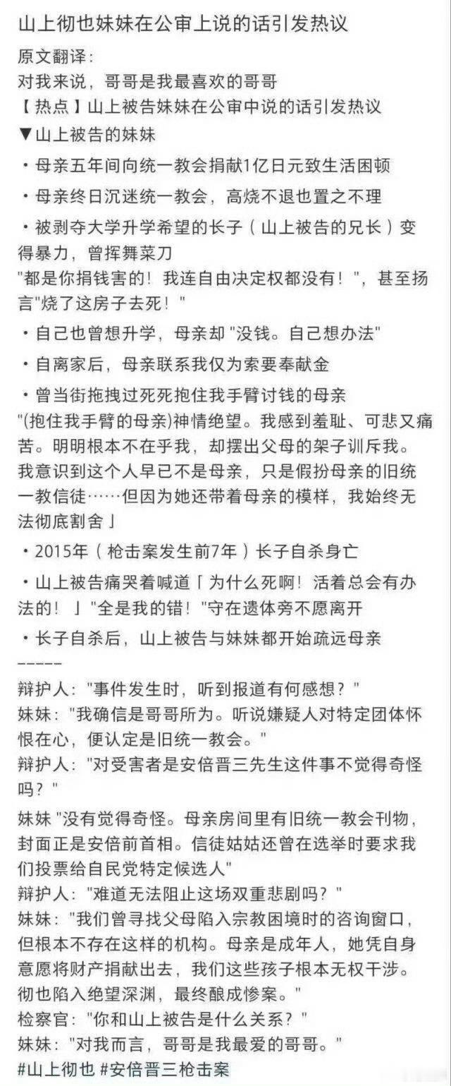山上彻也(日服第一男枪)妹妹在公审上的发言,看完觉得这兄妹仨太惨了。母亲信邪教(和安倍晋三有关)把家产全捐了,家里陷入贫困,兄妹三人全部辍学。2015年大哥自杀,2022年二哥山上彻也枪杀安倍。现在只剩妹妹一个人了。「对我而言,哥哥是我最爱的哥哥。」