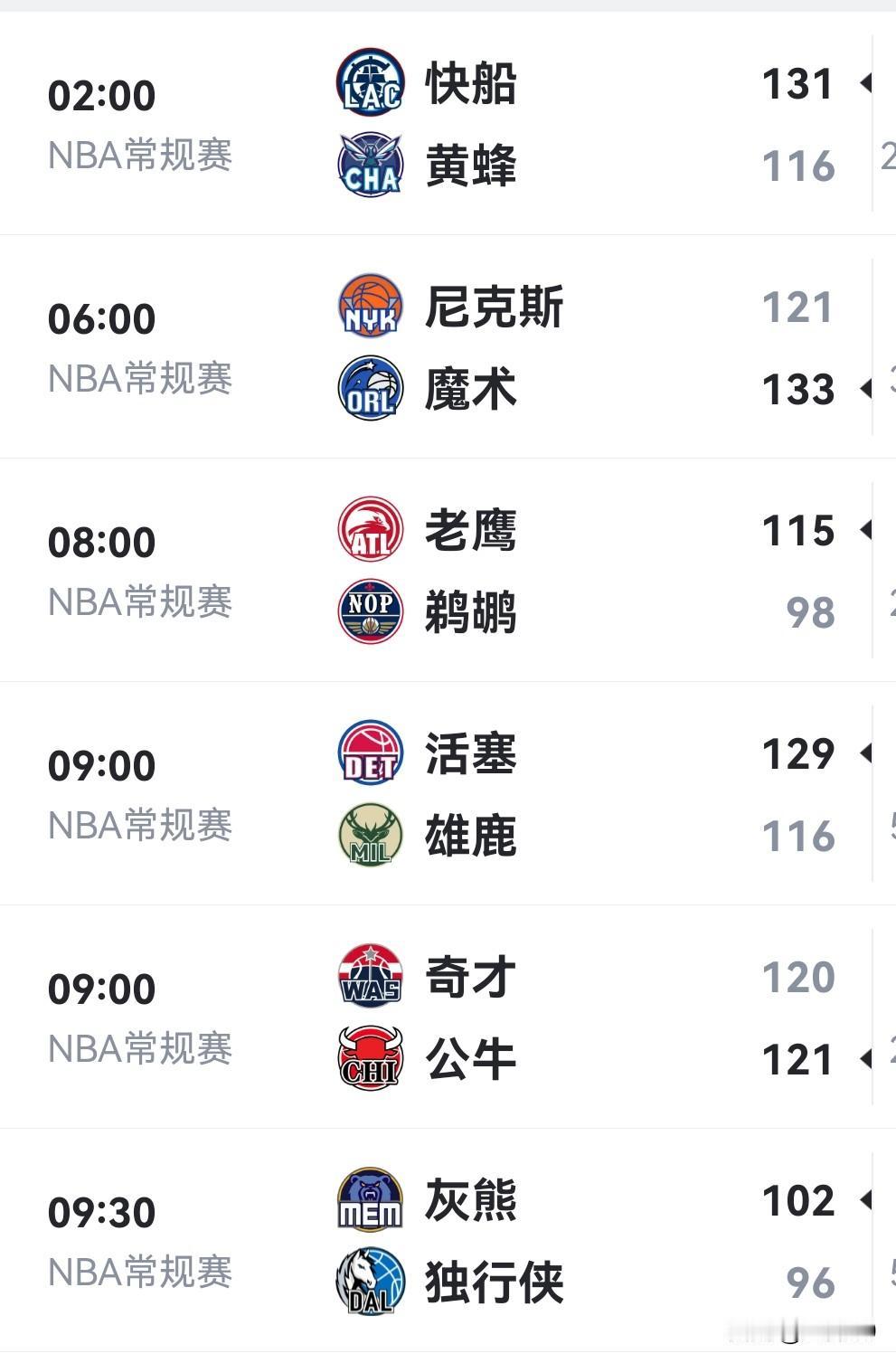 哈登55分创7大纪录!活塞12连胜领跑东部,NBA今日多场对决上演高分盛宴与绝杀时刻 1. 洛杉矶快船131-116夏洛特黄蜂 哈登状态爆棚成为取胜核心,全场26投17中,其中三分16投10中,罚球14投11中轰下55分,还贡献3篮板7助攻1抢断。黄蜂这边无人能匹配快船火力,克尼佩尔拿下全队最高的26分,最终快船轻松取胜。 2. 纽约尼克斯121-133奥兰多魔术 魔术收获3连胜,小瓦格纳火力全开砍下37分6篮板7助攻,贝恩和萨格斯也分别入账27分、26分。尼克斯虽有布伦森轰33分并送出11助攻,唐斯也贡献24分8篮板,但末节被魔术打出13 - 0高潮拉开分差,最终无力回天。 3. 亚特兰大老鹰115-98新奥尔良鹈鹕 波尔津吉斯以64.7%的投篮命中率拿下29分7篮板4助攻3盖帽,杰伦·约翰逊斩获18分11篮板9助攻的准三双。鹈鹕方面奎因得到20分9篮板,墨菲三世和贝也分别有19分、18分进账,可球队整体命中率不足,最终老鹰终结连败。 4. 华盛顿奇才120-121芝加哥公牛 这场对决以公牛1分险胜告终。公牛的武切维奇拿下20分12篮板8助攻的全面数据,怀特贡献17分。奇才这边基斯珀特拿到20分,惠特摩尔和萨尔分别得16分、14分,无奈球队末节仅得22分,被公牛抓住机会完成反超。 5. 底特律活塞129-116密尔沃基雄鹿 活塞豪取12连胜稳坐东部第一,还终结了对阵雄鹿的13连败,雄鹿则遭遇四连败。活塞核心康宁汉姆砍下29分8篮板10助攻的准三双,全队5人得分上双且助攻达32次。雄鹿因多名主力缺席体系混乱,仅罗林斯拿下24分,难以扭转败局。 6. 孟菲斯灰熊102-96达拉斯独行侠 灰熊实现逆转取胜,阿尔达马拿下20分8篮板4助攻,伊迪贡献12分15篮板4盖帽的亮眼数据。第三节阿尔达马单节砍10分助灰熊实现反超,末节又靠关键罚球锁定胜局。独行侠的汤普森空砍22分,威廉姆斯和华盛顿也分别得18分、15分,仍遗憾落败。