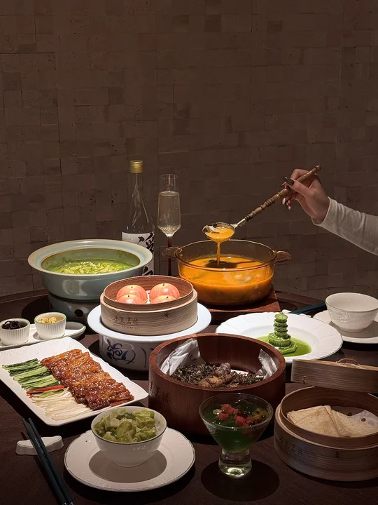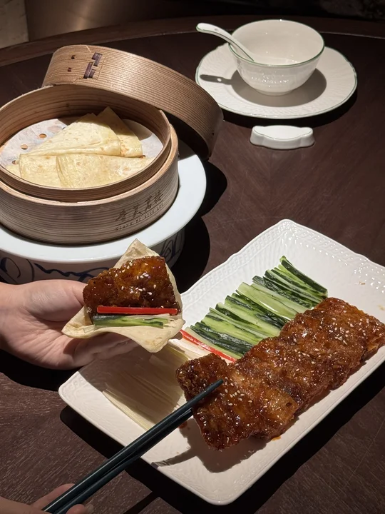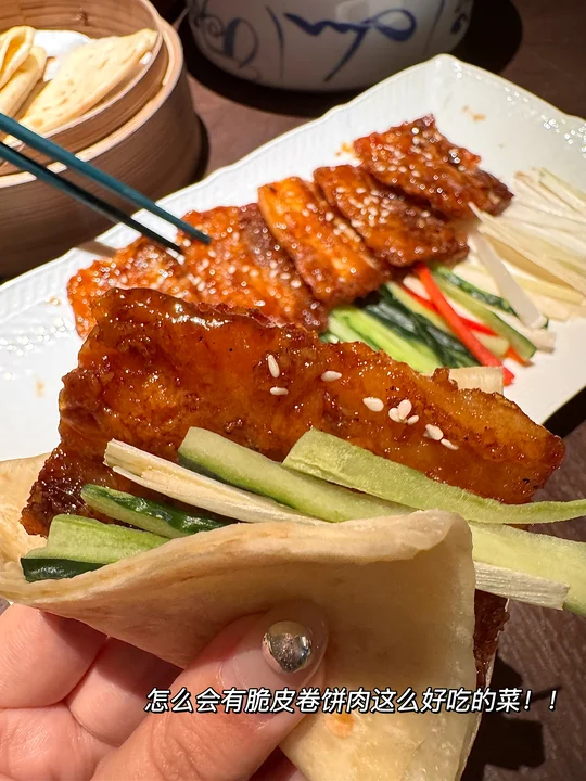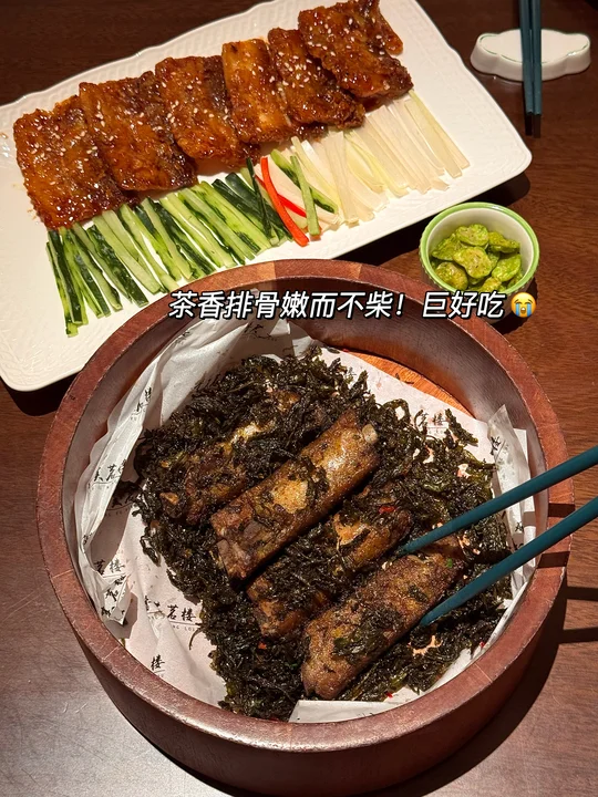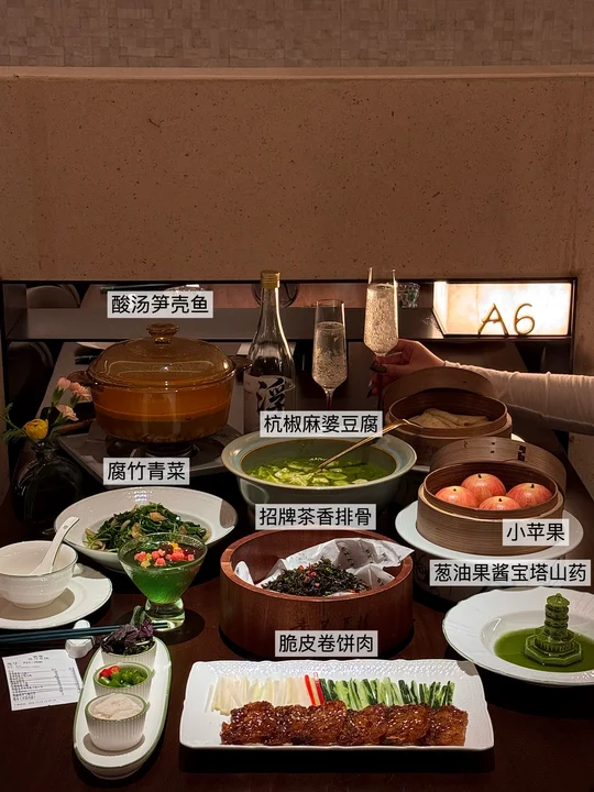 脆皮卷饼肉、秘制茶香排骨、杭椒麻婆豆腐、葱油果酱宝塔山药…该怎么形容这家店有多好吃!! 在杭州尝试过好几家浙菜了,这家(香芙茗楼)无论是环境还是口味都比同类型的店要更合我心意! 菜品精致而且随便点没有踩雷,以茶入菜好有江南诗意! 强推这个茶香排骨!嫩而不柴入口带有茶香 酥酥脆不腻巨好吃!酸汤笋壳鱼!鲜辣入味连汤都连喝了三碗!还有脆皮卷饼肉 外脆内润的炸五花+青瓜葱丝包进卷饼里,一吃一个不吱声😭整体用餐很安逸舒服!不管是生日聚会还是约会分手都很合适! 唯一的缺点大概就是饭点需要排队。。。