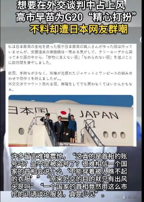 高市首相的“战袍”外交:用衣服的重量,压垮了外交的尊严? 家人们,快来看国际大秀!日本首相高市早苗女士,为了在G20峰会上“惊艳全场”,上演了一出真人版《穿普拉达的女王》。不是在研究峰会议题,而是在直播间(哦不,是社交媒体)激情开麦,直播“首相的衣帽间烦恼”! 几个小时?她不是在处理国家大事,而是在为穿哪件“战袍”才能“在外交谈判中占据上风”而纠结!这脑回路,简直是把国际政治当成了“谁穿得贵谁就赢”的小学生攀比现场。 网友的反应堪称教科书级别:“首相账号被盗了?”“我以为是行为艺术!”“外交目的就是出风头?” 这些灵魂拷问,简直比任何外交辞令都精准。一个国家的首相,把“不被瞧不起”挂在嘴边,把“占据上风”的希望寄托在几块布料上,这本身不就是最大的自轻自贱吗? 更讽刺的是,当她说出“咬牙买些好衣服”时,不知道有没有想过,日本民众的税款,是不是也该算进这件“外交战袍”的成本里?用纳税人的钱买来的“惊艳”,惊艳的究竟是谁?是那些需要务实合作的国际伙伴,还是她自己那颗患得患失的玻璃心? 这已经不是简单的“爱美之心”了,这是把国家形象当成了个人时尚秀的背景板,把严肃的外交场合当成了彰显个人品味的T台。当一位首相需要用几小时挑选衣服来证明自己的“价值”和“地位”时,这本身不就是一种最大的心虚和不自信吗? 说到底,外交的“上风”,靠的是实力、智慧和诚意,而不是几件华而不实的“战袍”。高市首相这波操作,非但没有“惊艳全场”,反而用她对衣服的过度执着,成功地让全世界看到了日本政坛的浮夸与浅薄。这哪是“精心打扮”,这分明是“自曝其短”啊!