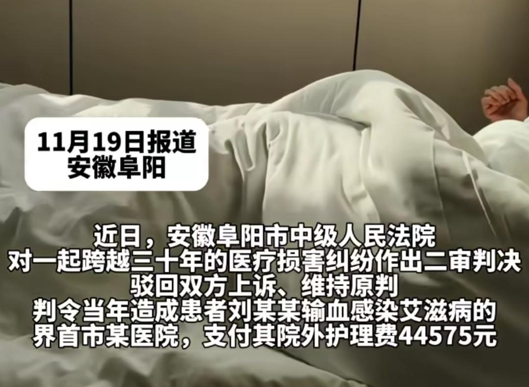 安徽一女子30年在医院做手术被感染艾滋病,索赔被医院拒绝,胜诉后,却只得到4万多赔偿。安徽阜阳的刘某某因为子宫肌瘤到界首市某医院做手术,在输血时被感染艾滋病。此后三十年,刘某某因丧失部分免疫功能导致肾损害、肝功能失常等多种疾病,反复生病住院,在23年一次出院时,医院出具“需长期监护的诊断证明”,刘某某和涉事医院协商不成,起诉到法院,法院认为刘某某确实是在医院感染的艾滋病,但因其无法证明目前患的多种疾病和艾滋病产生因果关系,因此只判赔偿4万多元。