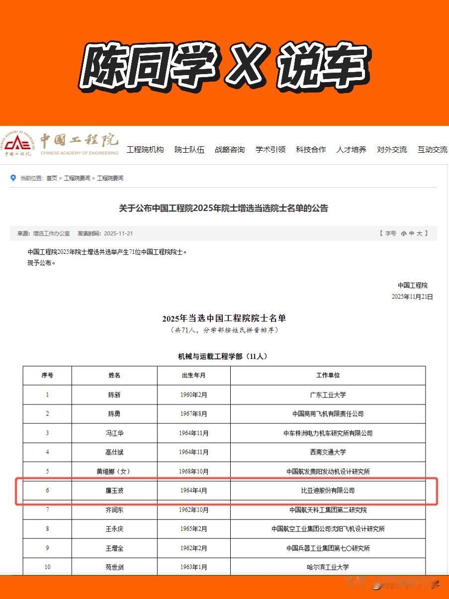 太振奋人心,2025年11月21日,中国工程院院士名单揭晓,比亚迪首席科学家、汽车总工程师廉玉波光荣上榜! 这位可真是实打实的“技术大神”!多年来,他一直埋头攻坚新能源汽车核心技术,从整车研发到电驱系统,多项突破都有他的身影。可以说,以技立身荣膺院士,妥妥的凭实力出圈👏! 廉工的当选,不仅是他个人的高光时刻,更让比亚迪“技术为王,创新为本”的标签闪闪发光。不少网友直呼:这才是中国智造该有的样子! 未来,有院士坐镇,比亚迪的技术创新更让人期待了~中国新能源汽车,继续冲呀!
