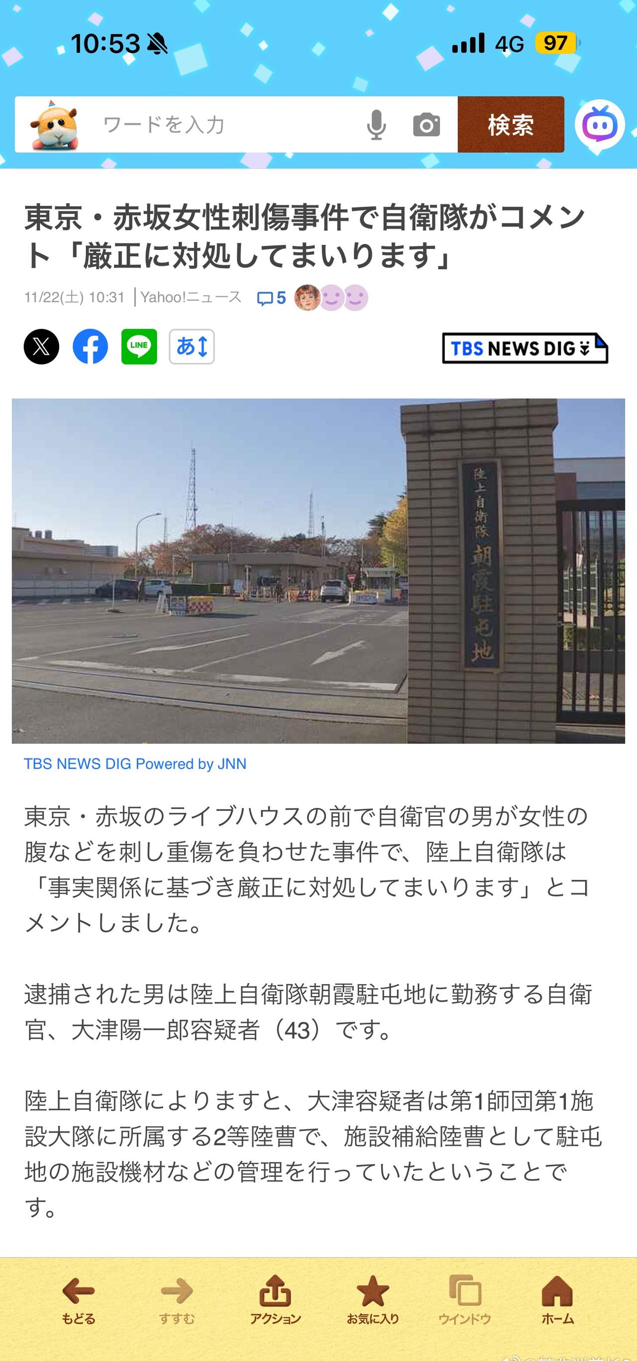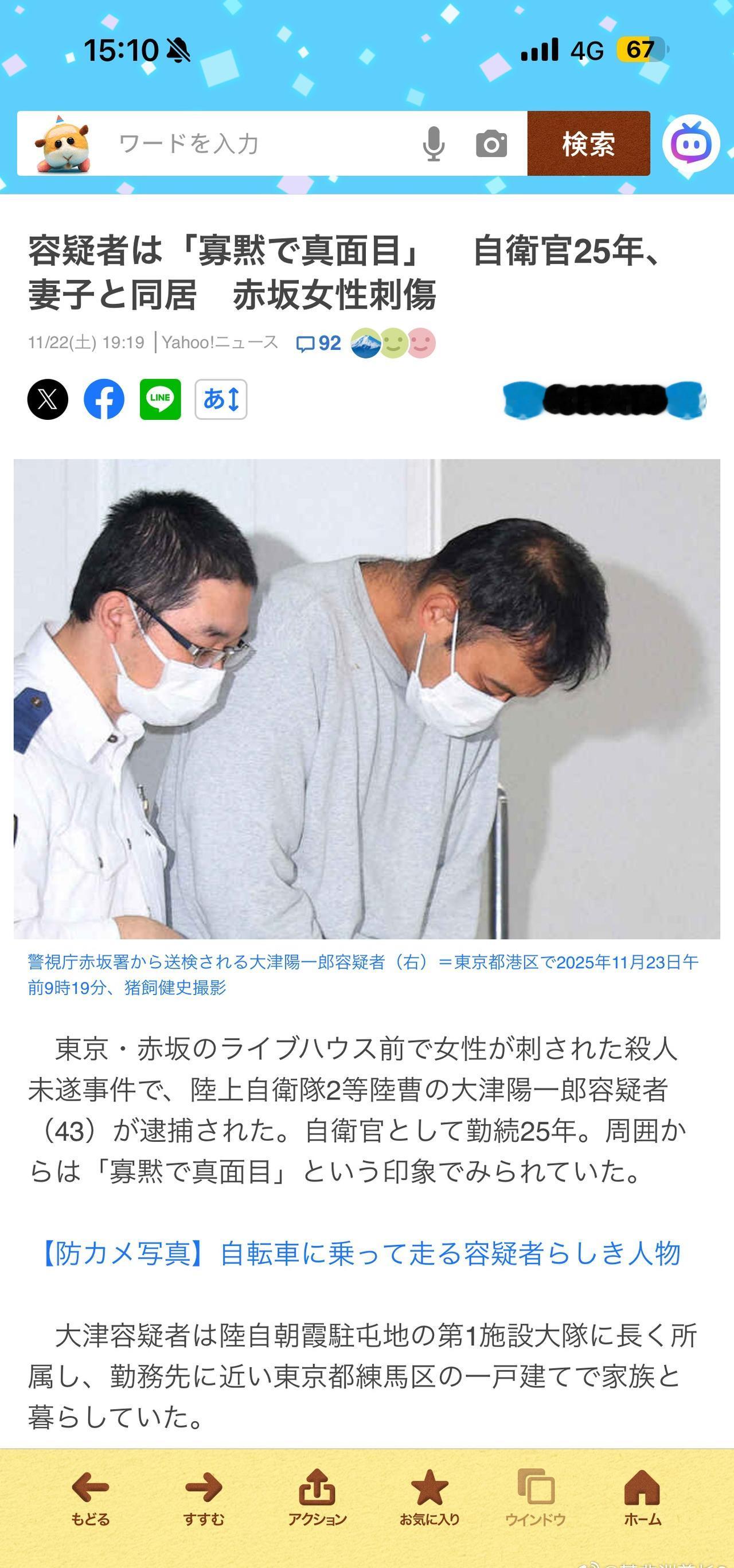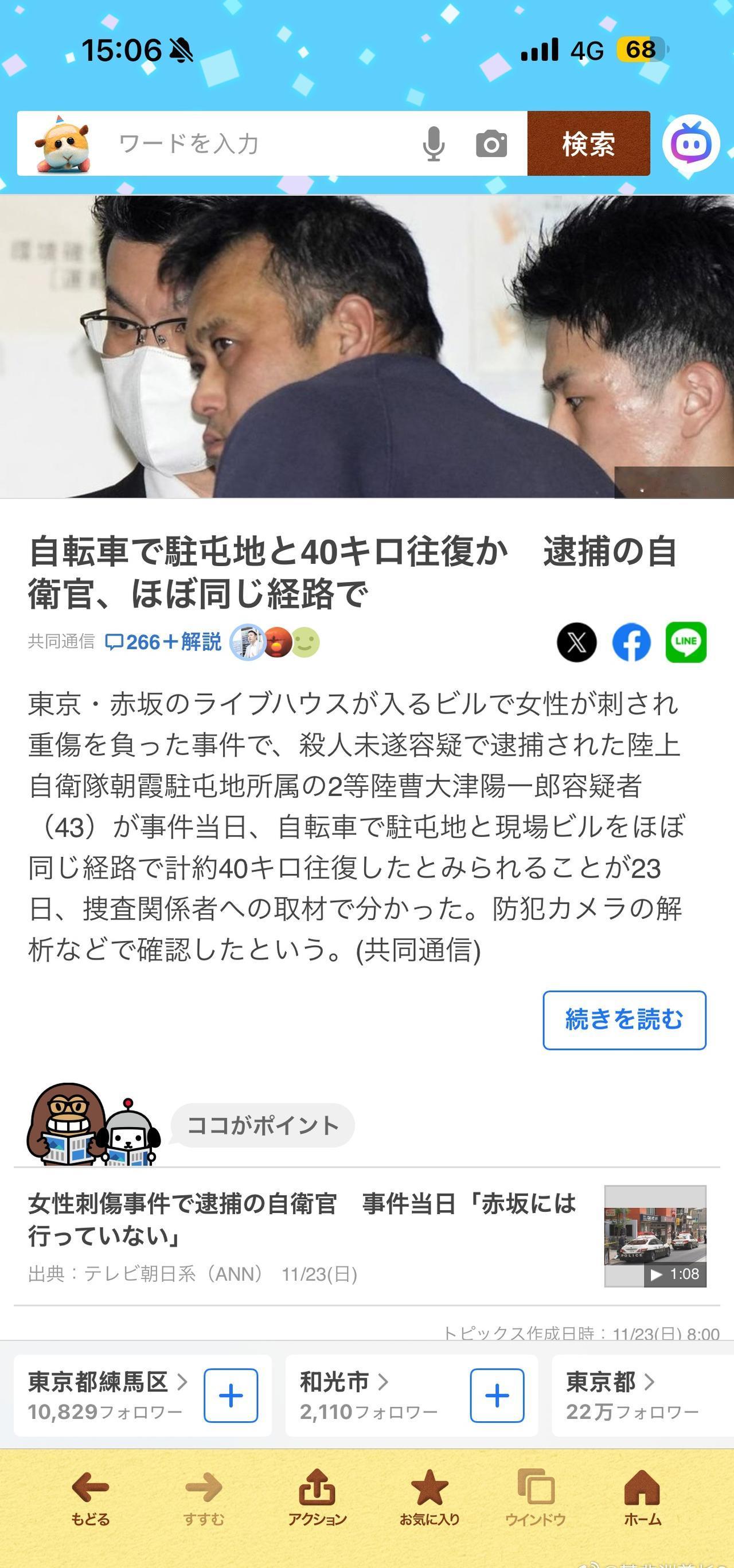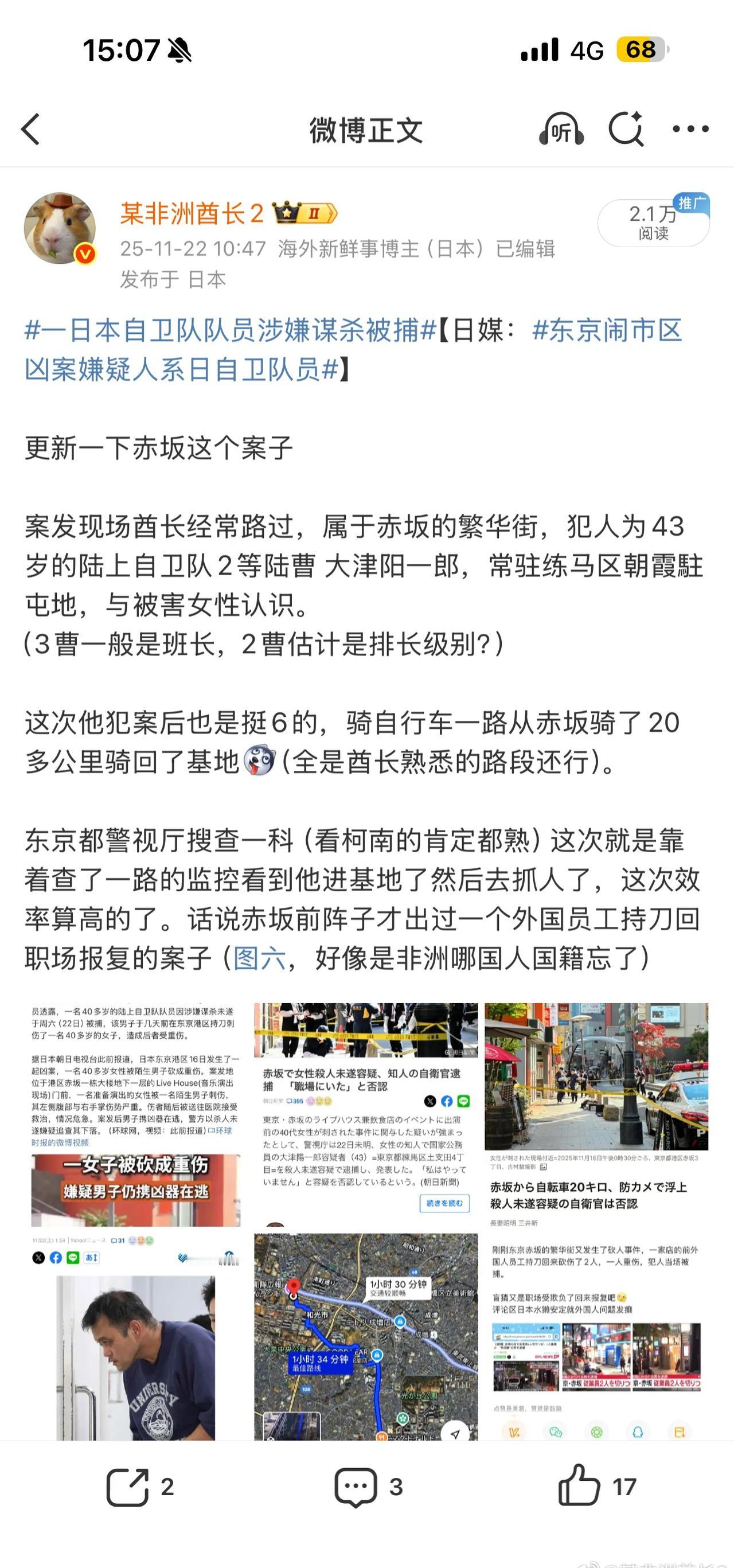 更新一下这个案子的后续 犯事的陆自队员是朝霞驻屯地第一师团第一设施大队的2等陆曹(排长级别),入伍25年,现负责器材与后勤管理,已婚有3个孩子,在练马区有个一户建,周围评价都是工作认真负责,平时家庭关系很好。 但是这位瞒着家里私底下和被害女性交往了9年(被害女性也不知道他结婚了),今年夏天说是和平分手