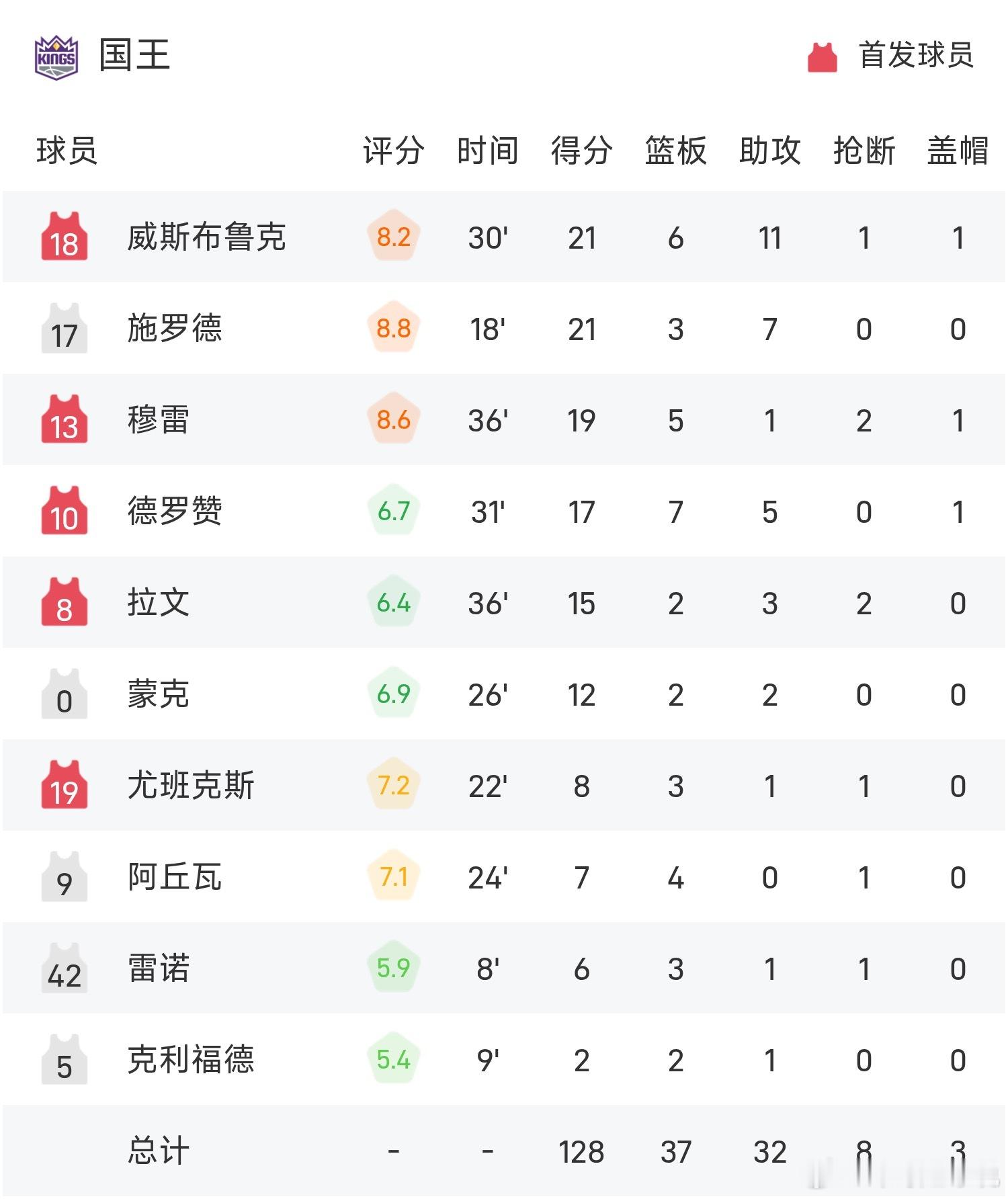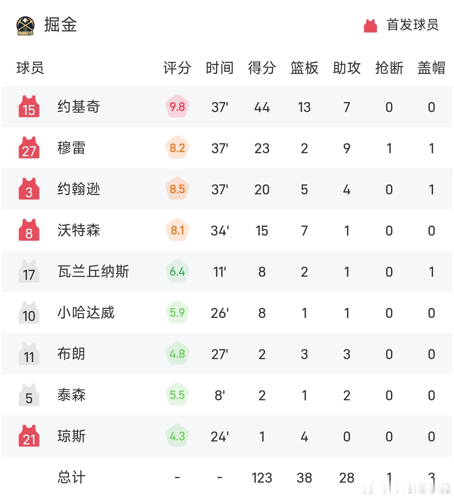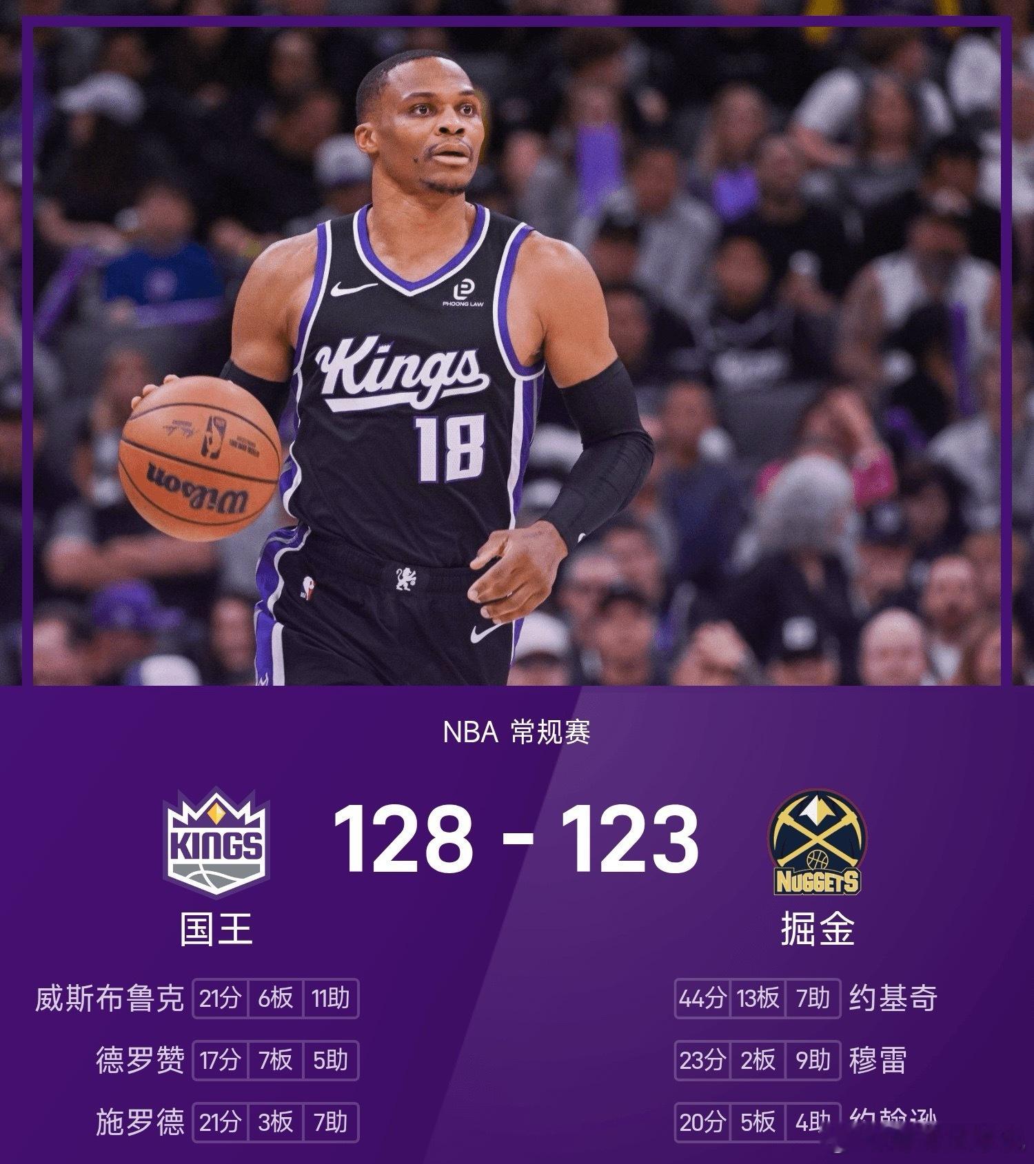 11月23日 25/26赛季NBA 常规赛,掘金对阵国王。双方全场战罢,掘金123-128不敌国王。威斯布鲁克得到21分6板11助率队取胜,约基奇空砍全场最高的44分13板7助。