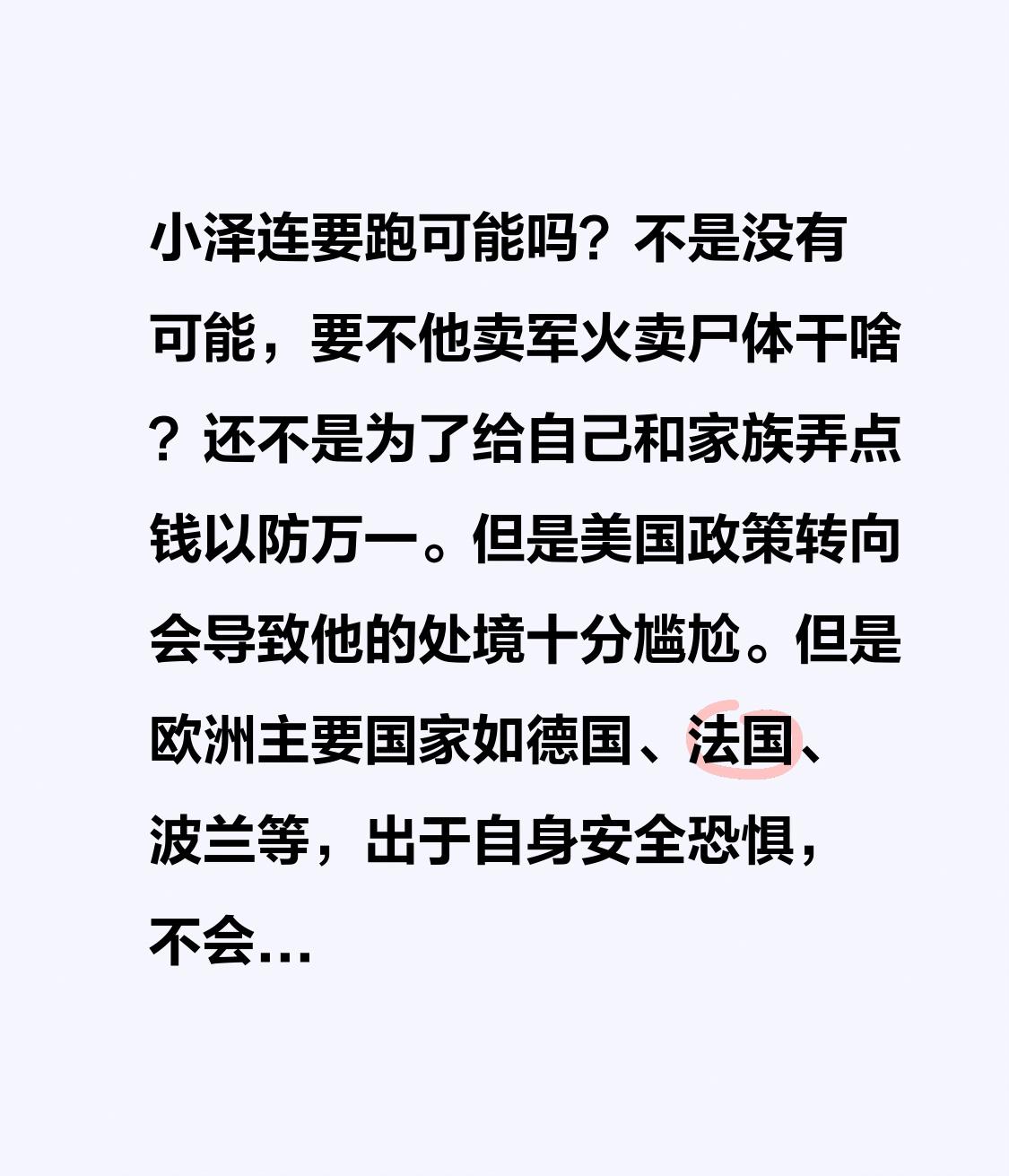 小泽连要跑可能吗?不是没有可能,要不他卖军火卖尸体干啥?还不是为了给自己和家族弄点钱以防万一。但是美国政策转向会导致他的处境十分尴尬。但是欧洲主要国家如德国、法国、波兰等,出于自身安全恐惧,不会完全放弃乌克兰。他们会尽力提供支持,并试图在美乌之间斡旋,寻求一个即便不利但能避免乌克兰彻底崩溃的方案。这可能会为泽连斯基提供一定的回旋空间。所以现阶段谈小泽连逃跑有点早,但一旦小泽连要逃跑估计他就会出意外。因为他不出意外战争就不会结束。