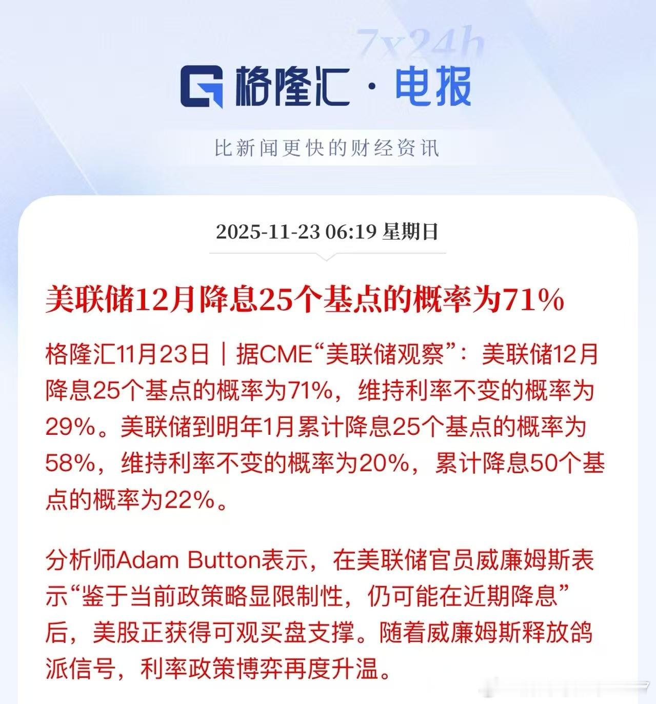 美联储12月降息25个基点的概率为71%这把外盘股,债,b该反弹了。