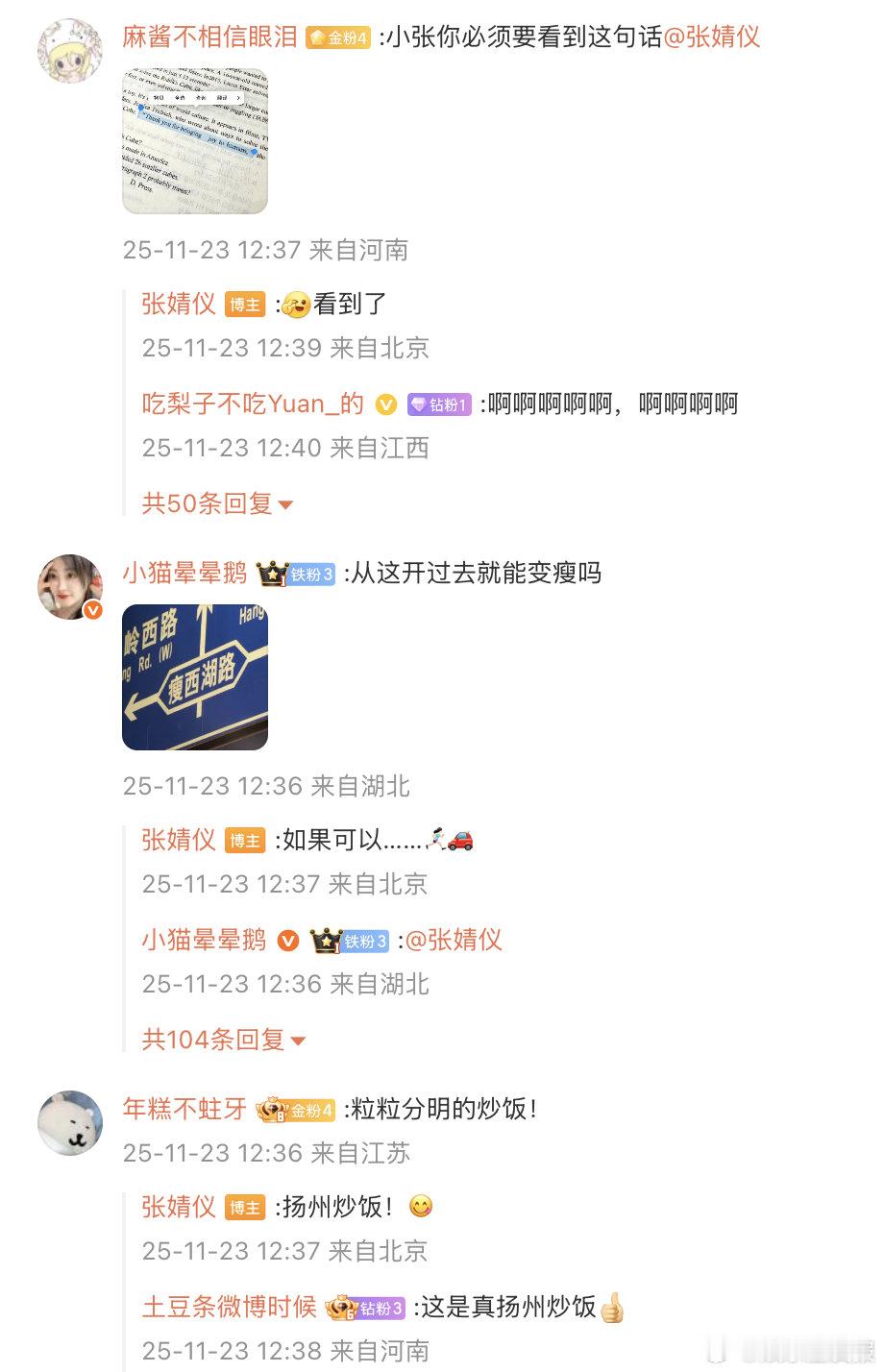 张婧仪与粉丝互动超有趣!有粉丝问 “从瘦西湖路开过去就能变瘦吗”,她俏皮回复 “如果可以……”;还有粉丝晒出文字内容 ,她也及时回应 “看到了”;面对 “粒粒分明的炒饭” 的讨论,她秒答 “扬州炒饭!”。不过大家也好奇,“这个婧仪的头发到底遭遇了什么”,坐等闺蜜更新揭秘~