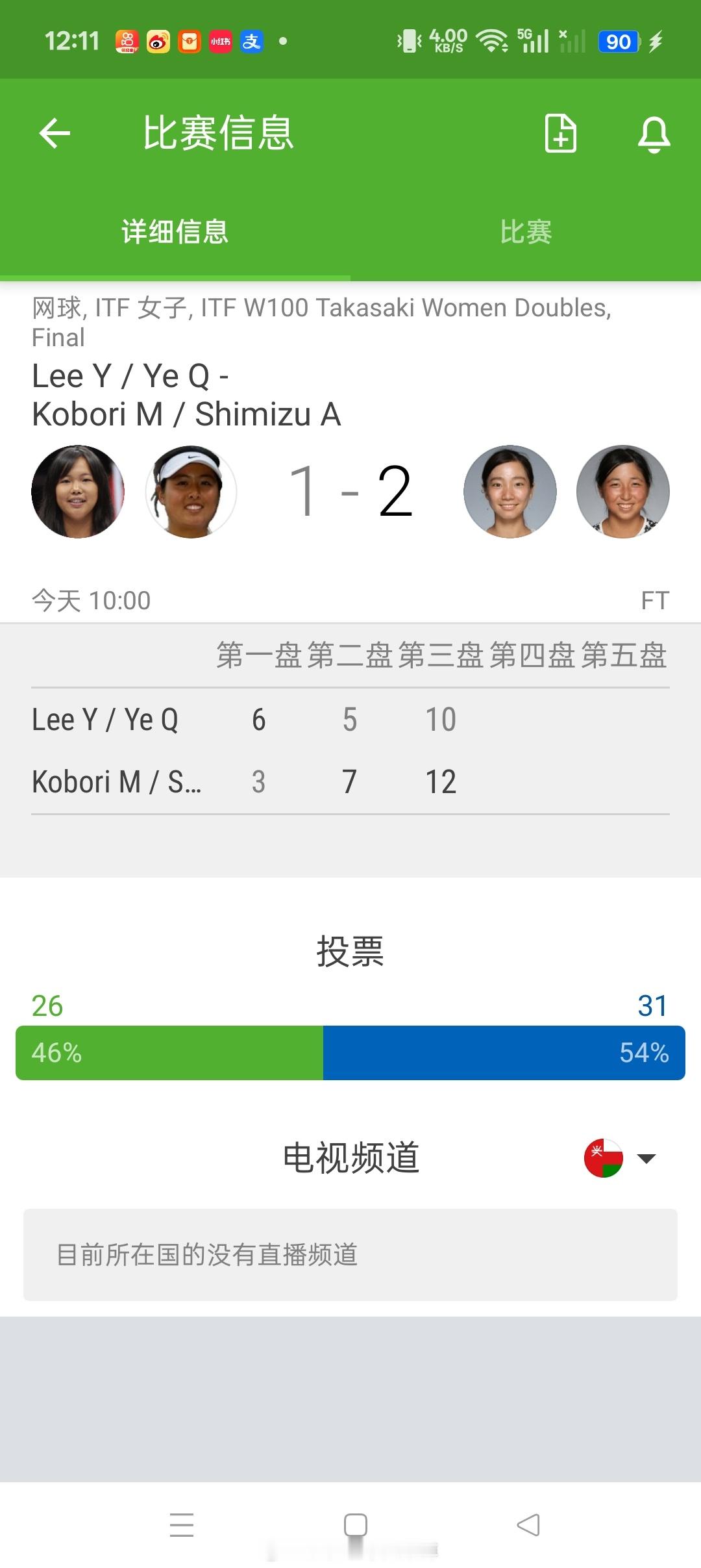 【🇯🇵高崎W100】女双决赛🇨🇳叶秋语/李亚芯6-35-710-12惜败🇯🇵球员小堀桃子/清水绫乃收获亚军今年8冠两亚收获65分即时排名259(+28)下周叶秋语搭档郑妩双出战澳网外卡赛