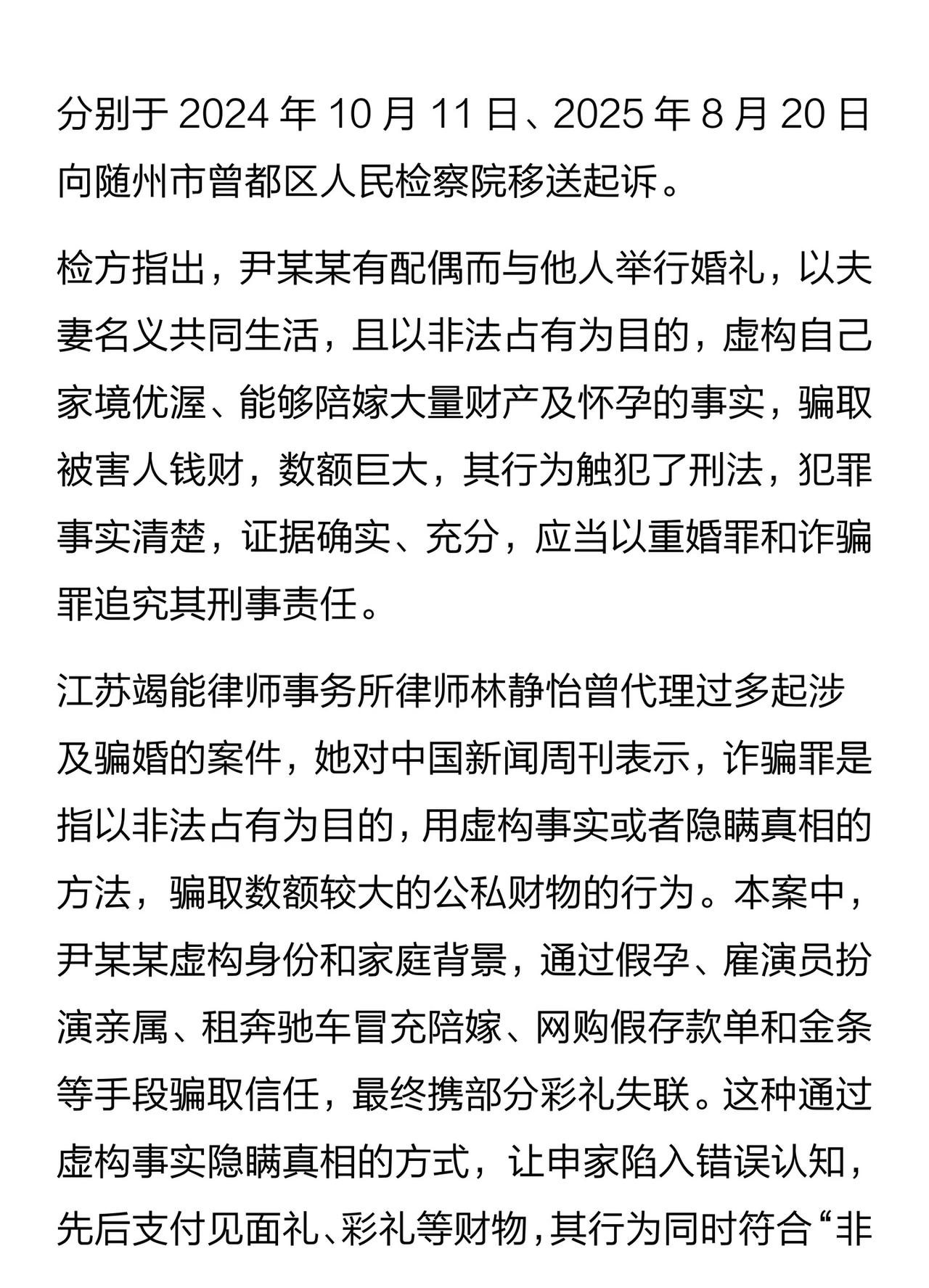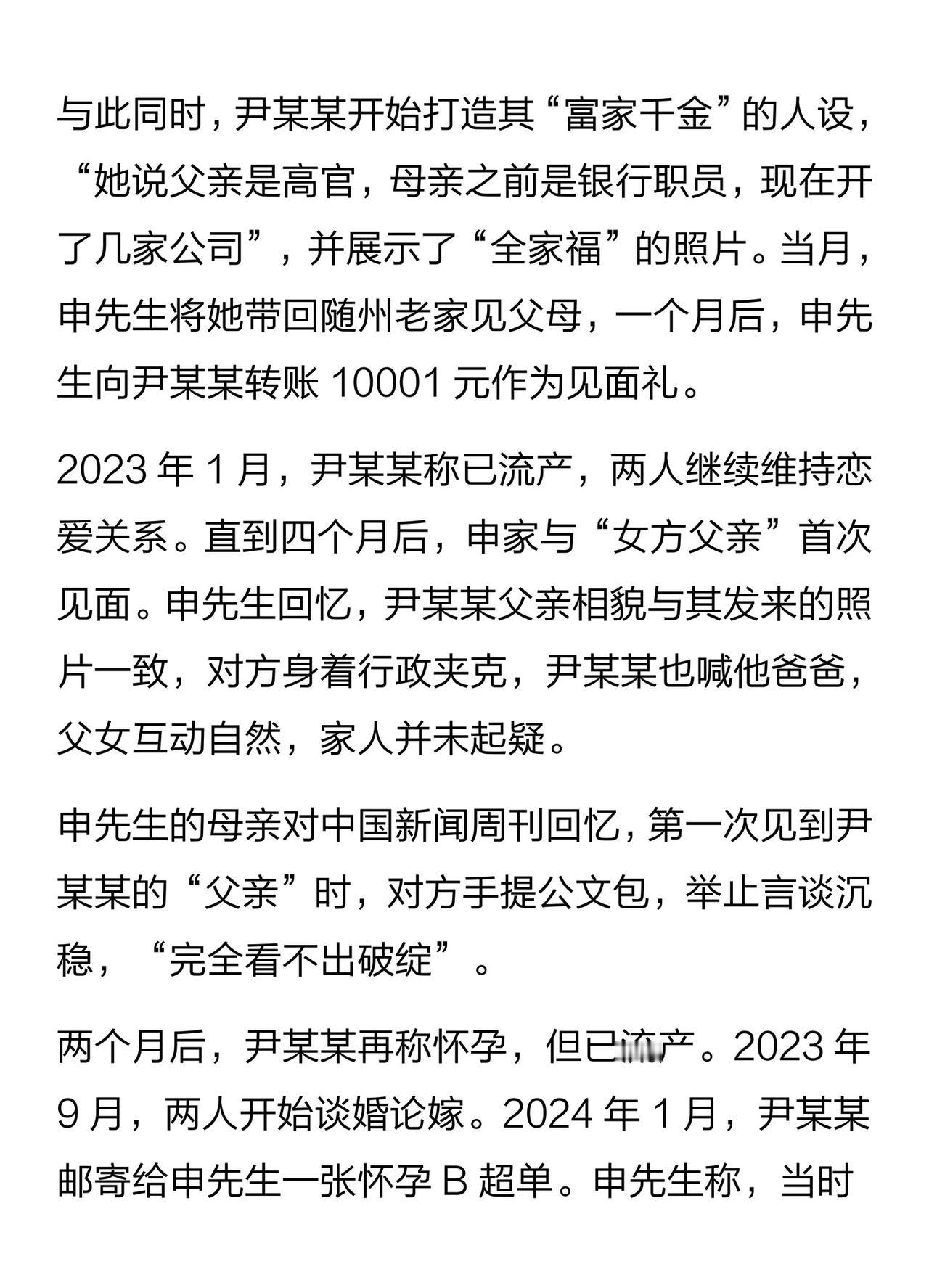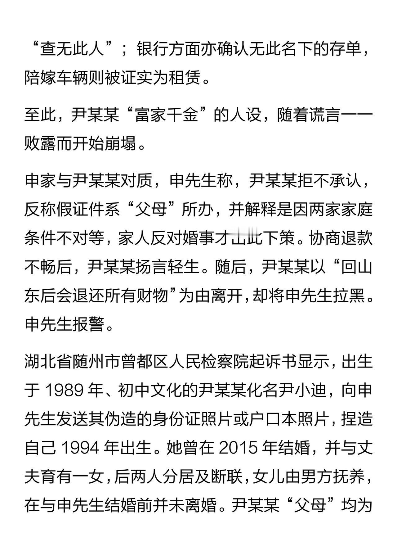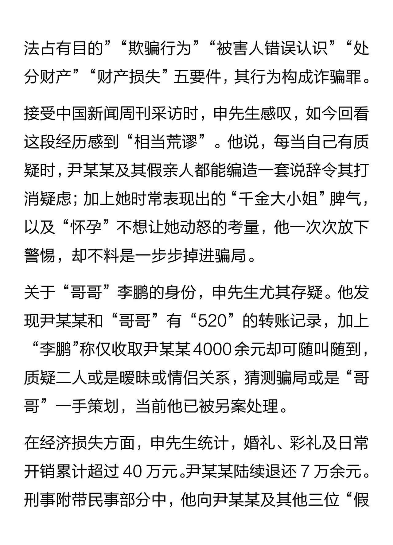 “富家千金”人设 随着谎言败露而开始崩塌 湖北随州的申先生与山东女子尹某某网恋奔现后,原以为自己进入了人生新阶段。申家拿出14.8万元彩礼,自称“高官家庭”的女方陪嫁一张“46万元存款单”“100克金条”和“一辆奔驰车”。 然而,令申先生没想到的是,陪嫁是假的,身份和怀孕是虚构的,女方隐瞒婚史,就连“岳父岳母”,也是花钱请来的演员。 11月17日,该案在湖北随州市曾都区法院一审开庭。申先生告诉中国新闻周刊,庭上,尹某某仅承认重婚罪,否认诈骗指控,“她也不愿意赔偿”,案件未当庭宣判。 记者:解雪薇(xiexuewei@chinanews.com) 编辑:胡韵 中国新闻周刊 热点 保护自身权益 谣言止于智者 法律面前人人平等