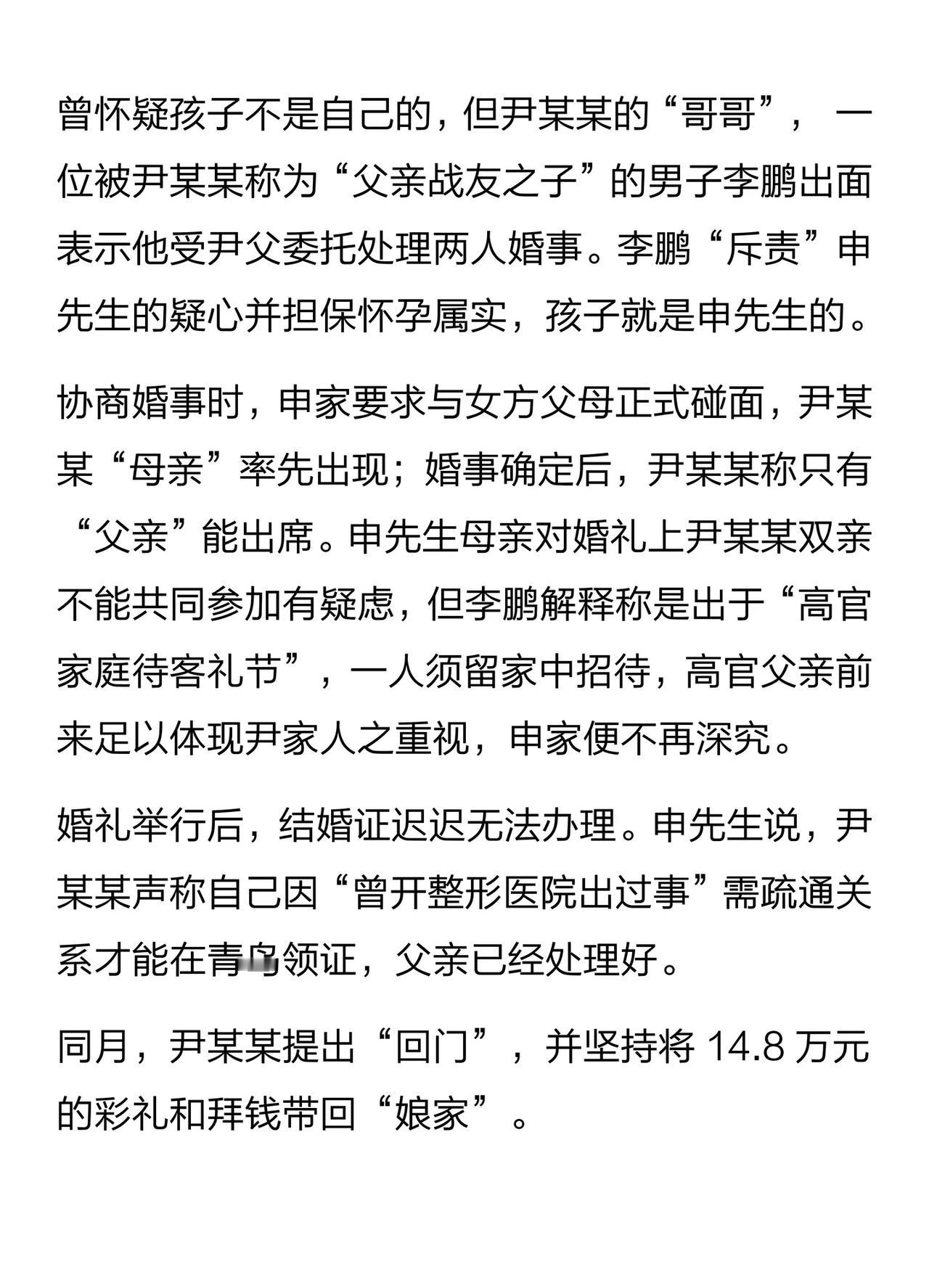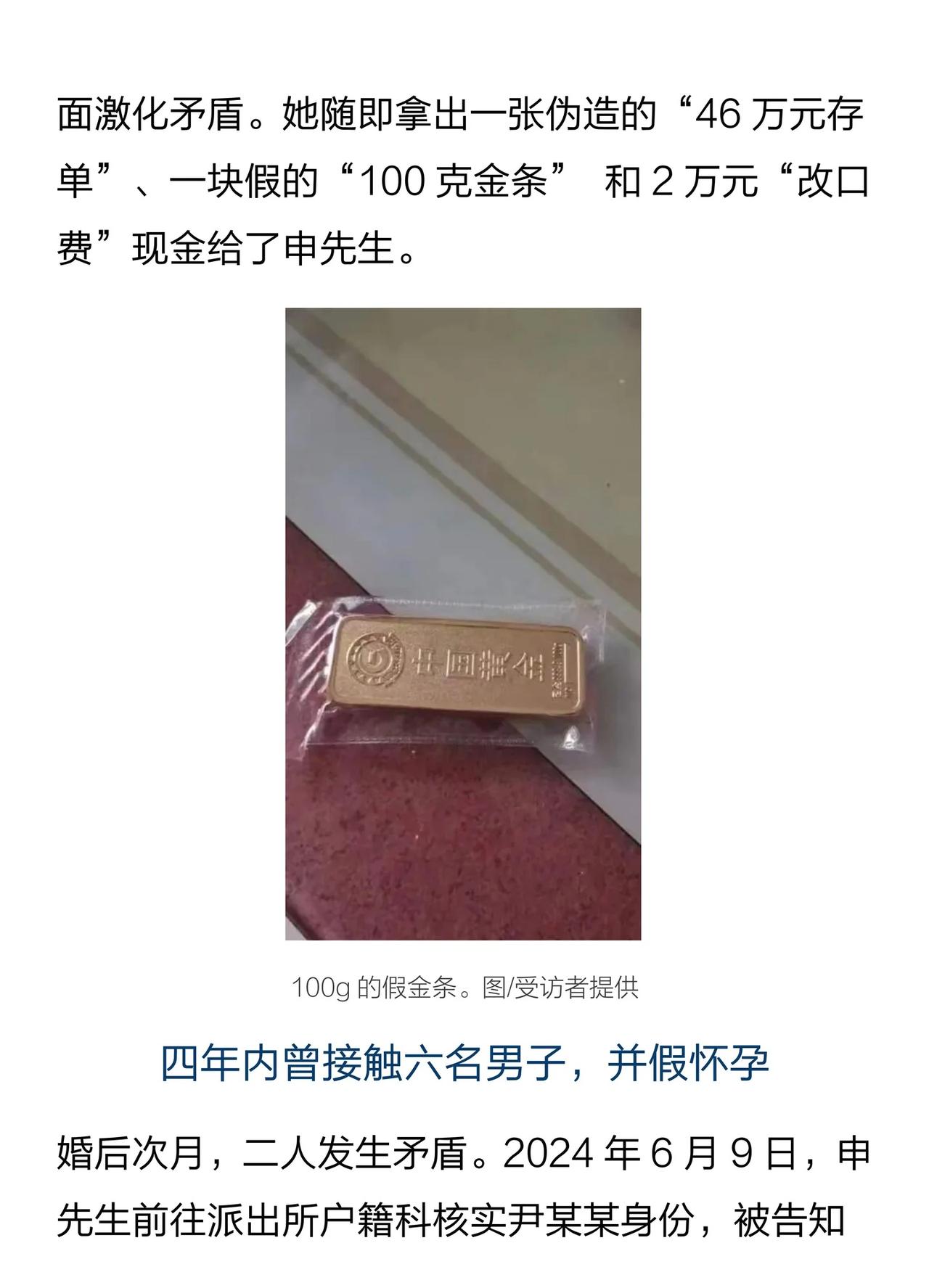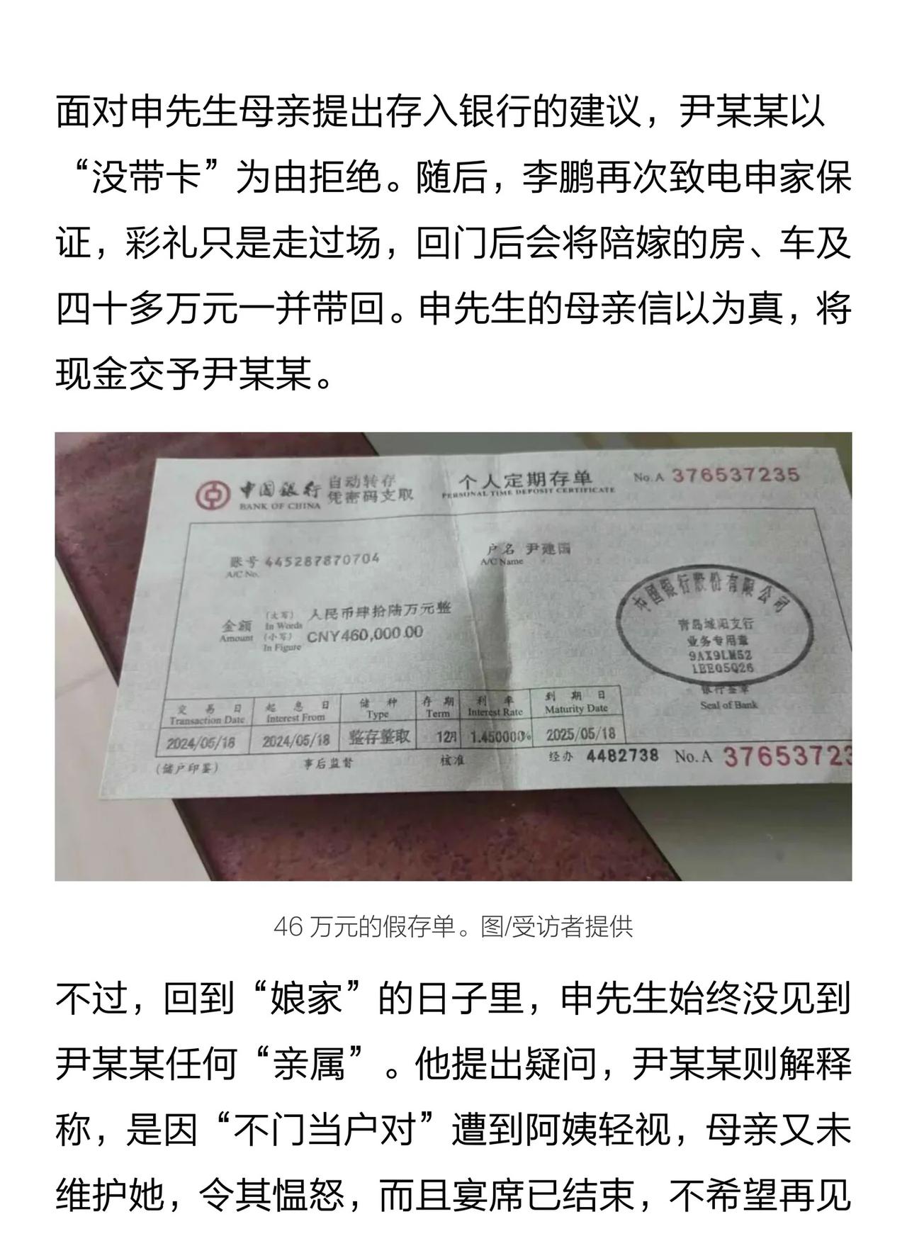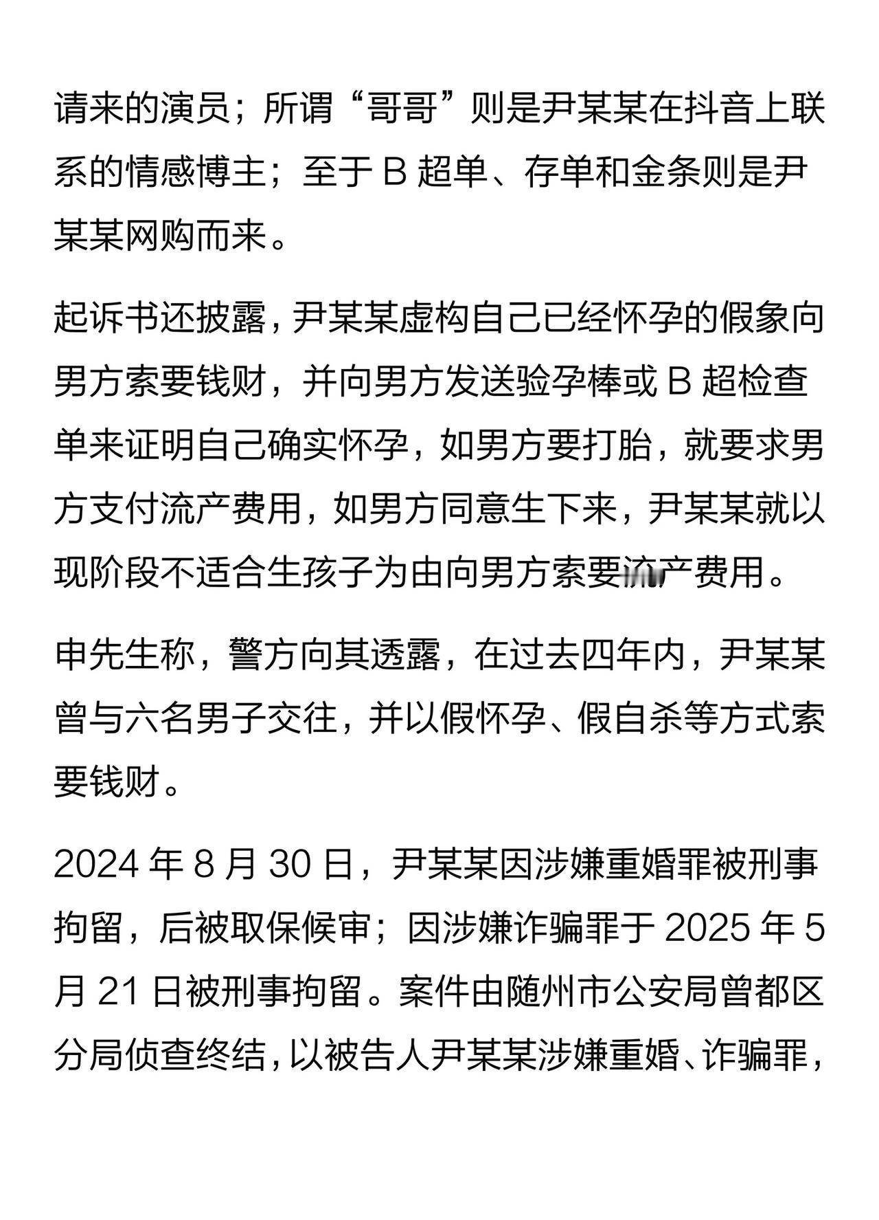 “富家千金”人设 随着谎言败露而开始崩塌 湖北随州的申先生与山东女子尹某某网恋奔现后,原以为自己进入了人生新阶段。申家拿出14.8万元彩礼,自称“高官家庭”的女方陪嫁一张“46万元存款单”“100克金条”和“一辆奔驰车”。 然而,令申先生没想到的是,陪嫁是假的,身份和怀孕是虚构的,女方隐瞒婚史,就连“岳父岳母”,也是花钱请来的演员。 11月17日,该案在湖北随州市曾都区法院一审开庭。申先生告诉中国新闻周刊,庭上,尹某某仅承认重婚罪,否认诈骗指控,“她也不愿意赔偿”,案件未当庭宣判。 记者:解雪薇(xiexuewei@chinanews.com) 编辑:胡韵 中国新闻周刊 热点 保护自身权益 谣言止于智者 法律面前人人平等