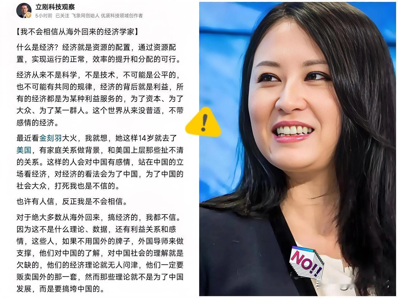 金刻羽中美关系言论惹争议 项立刚点评直击核心 网友:说到心坎里 海归学者金刻羽,因其对中美关系及中国经济的相关言论引发广泛争议与关注,其中部分涉中外经济互动的观点曾引发公众热议。 行业人士项立刚针对海归学者中部分西方理论适配性问题这一现象进行了尖锐点评,说一些海归经济学家,回国不是为了帮助我们发展,带回的西方理论,不一定是用来服务我们的,有可能给我们带来经济上的麻烦。 经济是利益和感情交织而成的,回到这里的海归,带回的理论,是用来帮助我们发展的,还是用来帮助西方发展的,带回的这些西方经济学理论,你们自己喜欢吗? 你们喜欢他们的话语体系吗? 如果不喜欢,那为什么还要继续使用他们的理论? 这些海归学者,对东方大国有真正的感情吗? 他们的理论,是帮助我们发展的,还是帮助西方发展的? 网友:大叔说得好!西方的科学技术可以学习,经济学和社会学要结合本土实际区别对待! 网友热评:留学学习自然科学的海归我信,那些学文科回来的我基本上都不信! 友友你们怎么看?