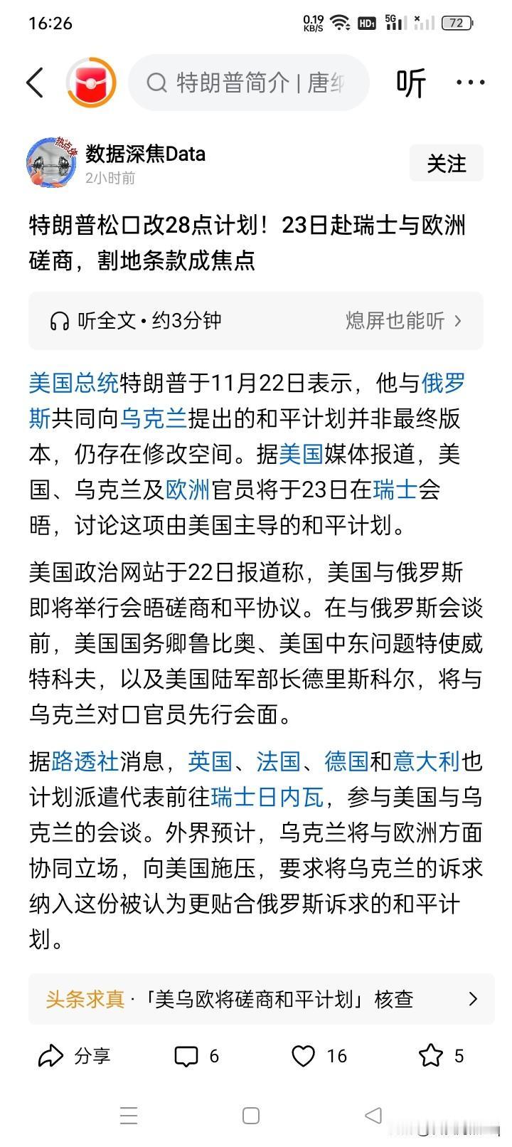 扑朔迷离? 这几天爆出来的结束乌克兰战争的所谓28条和平协议计划草案,网络上的消息似乎有的说是美国国务卿卢比奥和特使威特科夫与俄罗斯的一个特使搞的,好像还有人说是美国人搞的,特朗普同意的,更有消息说又似乎说是俄罗斯人的意思,美国人只不过是起了个传递信息的角色,等等。 由此可见,这个所谓的28条,大概率不过是道听途说,并不是完整的、或者说确定的计划,至多好像不过就是个幻想。