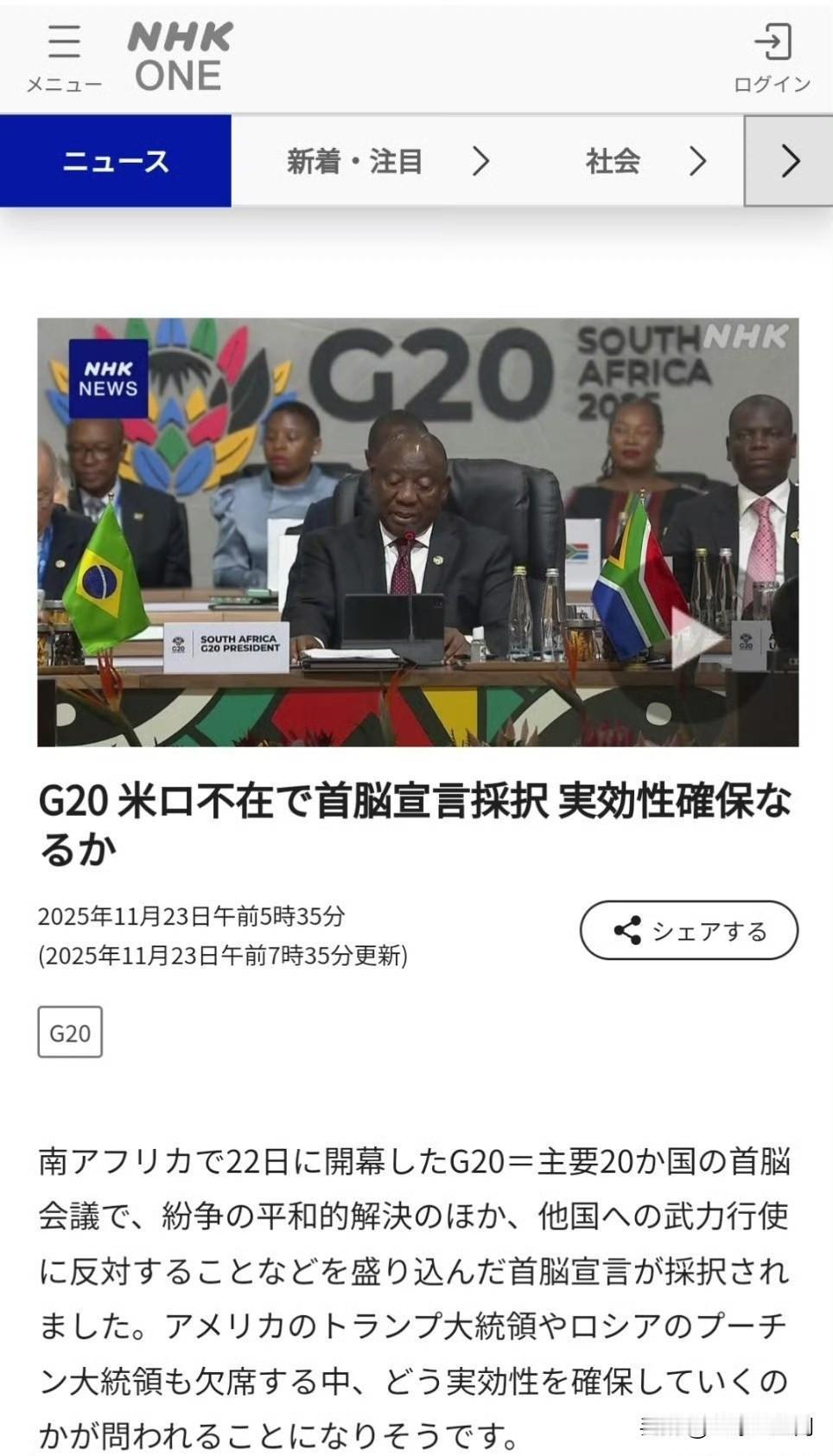 在南非于22日开幕的G20(主要20国)首脑会议上,通过了首脑宣言,其中除了包含和平解决争端之外,还包括反对对他国使用武力等内容。在美国总统特朗普和俄罗斯总统普京均缺席的情况下,如何确保宣言的实效性可能将受到质疑。 (NHK报道)