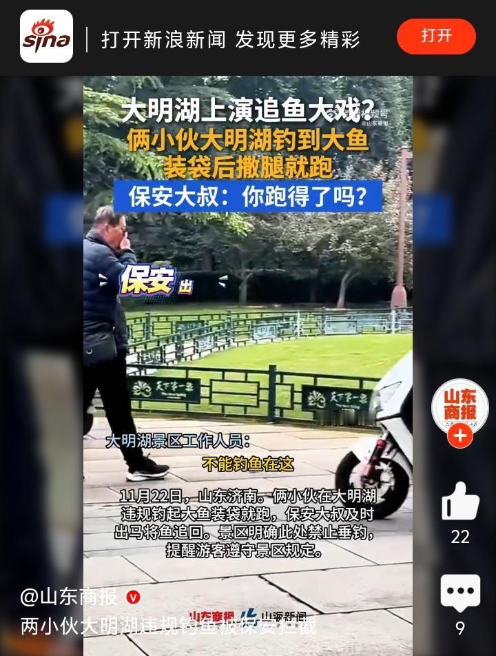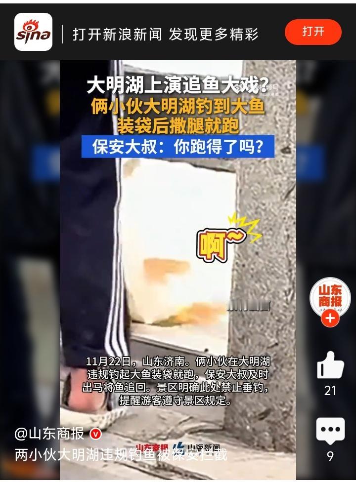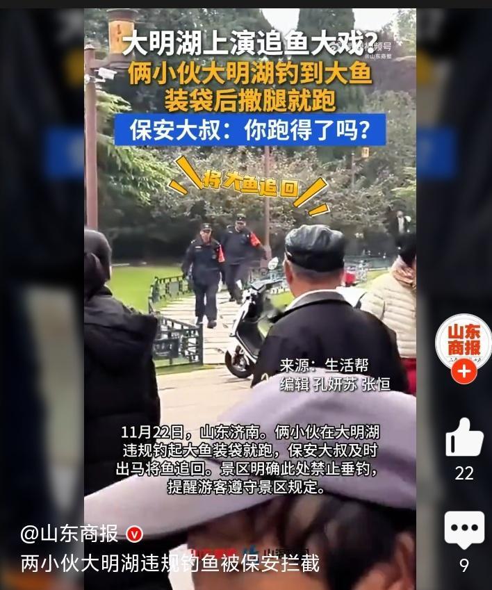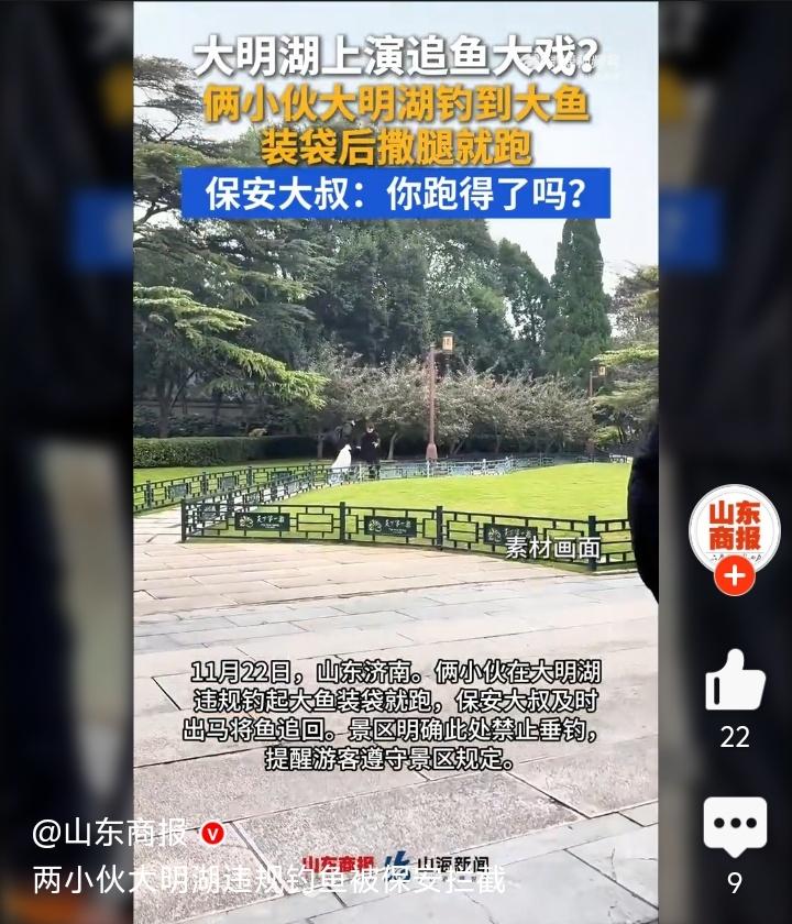 大明湖惊现钓鱼大逃亡!保安大叔百米冲刺夺回大鱼,背后真相让人拍案叫绝 (来源:山东商报) 初冬的大明湖波光粼粼,谁也没想到,一场堪比电影情节的“追鱼大戏”在此悄然上演。两名年轻男子手持钓竿,在禁止垂钓的景区内悄然收线,一尾鳞光闪烁的大鱼破水而出。他们迅速将战利品塞进编织袋,转身狂奔,却不知身后早已锁定了一道身影。 “跑什么跑!景区规定看不见吗?”保安大叔中气十足的喝声划破宁静。他如离弦之箭般追出,脚步稳健,目光如炬。湖边游客纷纷驻足,只见一道深蓝色制服的身影在绿荫道上疾驰,与两名慌不择路的年轻人展开角逐。 这不仅仅是一次违规钓鱼的拦截,更是一场关于责任与公德的较量。保安大叔的每一步都踏出了坚守岗位的执着,而年轻人仓皇的背影,则映照出部分人对规则的无视。湖面倒映着追逐的剪影,仿佛在质问:为何总有人将公共资源视为私产? 据景区工作人员透露,大明湖作为济南的城市名片,每年因违规垂钓导致的生态损失难以估量。湖中鱼类不仅是景观的一部分,更是水体净化的天然助手。两名小伙的行为,看似是“一时手痒”,实则是对公共环境的漠然践踏。 保安大叔的穷追不舍,最终以胜利告终。他拦下二人,取回仍在袋中扑腾的大鱼,轻轻将其放归湖中。这一放,不仅是生命的回归,更是对规则的郑重宣誓。围观游客中爆发出阵阵掌声,有人高喊:“大叔好样的!” 事件背后,折射出当代社会规则意识的缺失。从景区禁钓标志前的视若无睹,到被抓包后的狼狈逃窜,年轻人的举动暴露了侥幸心理与责任感的断层。而保安的坚守,则像一面镜子,照见了平凡岗位上的不凡担当。 网友评论瞬间引爆热议。“保安大叔跑出了正义感!”“年轻人该好好反思,景区不是你家后院!”也有声音感叹:“若能把这份机灵用在正道上,何愁不成事?”一条鱼搅动的不仅是湖水,更是公众对文明出游的深刻思考。 此事绝非孤例。全国多地景区曾曝出偷钓、逃票等行为,甚至有人为逃避监管夜间作案。专家指出,强化规则教育需从细节入手,让“敬畏之心”成为社会共识。而如保安大叔这般的一线守护者,正是文明进程中不可或缺的基石。 大明湖的涟漪终将平静,但这场追逐留下的启示远未结束。当我们漫步景区时,是否也曾动过“越界”的念头?或许,每个人都需要一次“灵魂追问”:在无人注视的角落,你能否守住心中的规则底线? 文明旅游 规则意识正能量守护 大明湖 钓大鱼 大逃亡 保安 百米冲刺