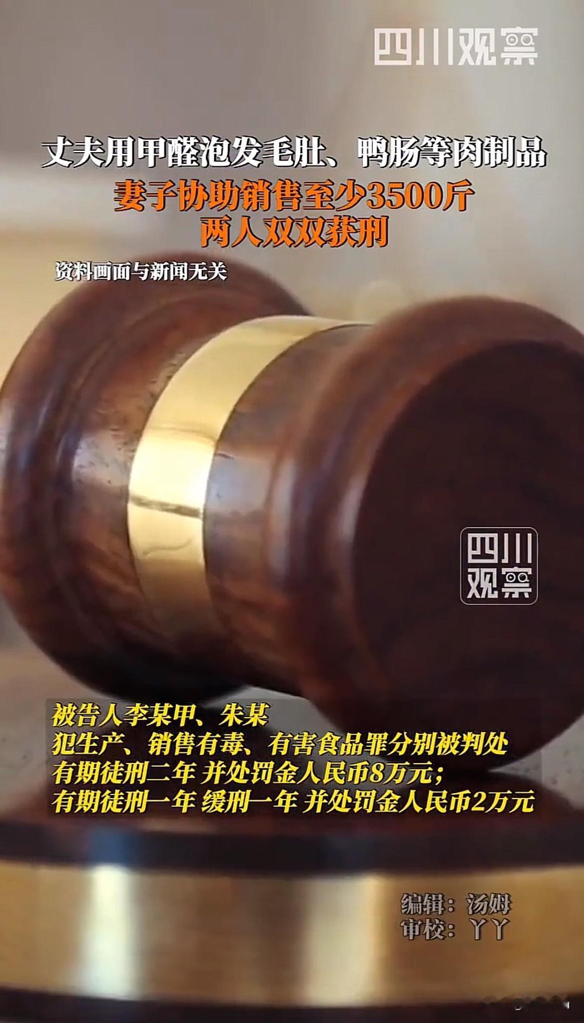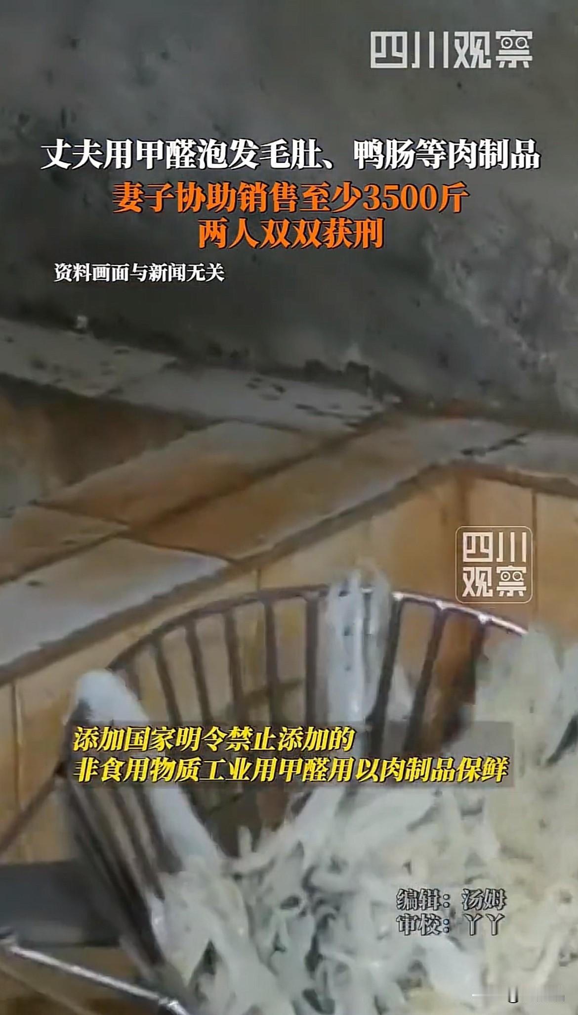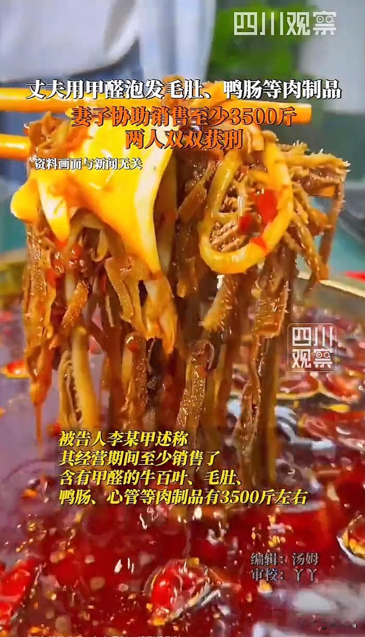 黑心夫妻!丈夫为保鲜生毛肚、鸭肠等肉制品,竟用工业甲醛泡发,妻子协助售卖,销售近3500斤。 自2020年以来,丈夫李某在销售的牛百叶、毛肚、鸭肠等生鲜肉制品中添加国家明令禁止添加的工艺用甲醛,只为给肉制品保鲜,增加弹性。而妻子朱某明知食品添加了甲醛,仍协助售卖。最终双双被判刑,并处罚金。 他们怎么敢?人们吃进肚子里的东西,竟敢添加甲醛这种有毒有害物品?这会对人体产生不可逆的伤害,这简直是谋财害命。 商家合法合规经营才是正道,投机取巧的伎俩只会搬起石头砸自己的脚。 图源:四川观察 夫妻生产售卖甲醛毛肚获刑晒图笔记大赛