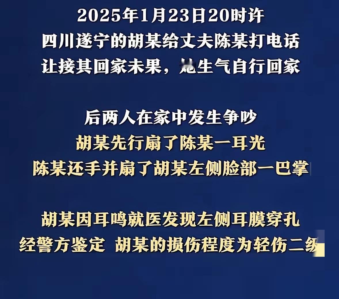 冤不冤? 四川夫妻因接下班起争执, 老婆先甩一巴掌,老公反手就把人打成耳膜穿孔,最后被判拘役6个月! 很多人觉得“她先动手在先”,老公还手顶多算防卫过当,但法律真不这么看!老婆的耳光再不对,打完就结束了,老公后续蓄力打要害,根本不是正当防卫,而是实打实的故意伤害。 夫妻过日子哪能没矛盾?冷天等不到接送委屈可以说,但动手就破了底线,而“以牙还牙”更是把家庭纠纷变成了刑事犯罪。 别觉得夫妻间动手是家务事,轻伤二级就够得上刑法,一时冲动换半年拘役,夫妻情分也彻底凉了,太不值! 你觉得这判决合理吗?如果遇到伴侣先动手,你会怎么处理?评论区说说你的看法!夫妻矛盾