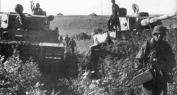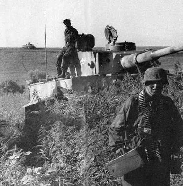 帝国师的虎式准备发起进攻。 1943年库尔斯克的典型照片,2SS帝国装甲掷弹兵师2SS装甲团第8连的虎。车体前装甲左侧可见帝国师参加城堡行动的伪装师徽,炮塔侧面有第8连的标志白色恶魔。炮塔侧面无烟幕弹发射器及支架,但还能看到安装基座,意味着是被直接拆除的。 注意后方走来的携带火焰喷射器的士兵,看来前面出现了苏军雷区或强固阵地,战斗工兵被派上来了。