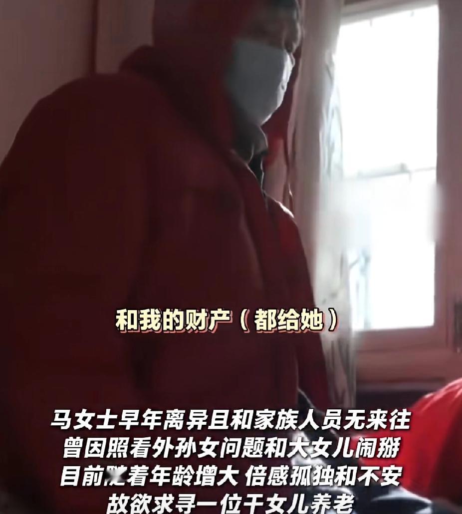 奇葩!河南郑州75岁马女士全网认“干女儿”,老人:“大女儿不理我,二女儿残疾!”愿给“干女儿”一套房和每月3000元的工资! 老人称:自己早年离异带大两个女儿,后来因带外孙女的事情与大女儿闹掰,二女儿又是个残疾人!随着时间的流逝,自己倍感孤独和无助!所以想认一个“干女儿”陪伴自己,照顾自己的生活。除了每月3000的工资,还愿意将自己名下的一套房产赠予“干女儿”。 对于马女士的荒唐做法,大女儿表示:“她的房子想给谁就给谁,跟我没关系!” 很多网友表示:说好的一套房产和每月3000的工资,说到底房产没有继承权,就等于画大饼,而马女士百年之后的遗产肯定是亲生子女优先继承,根本不会轮到所谓的“干女儿”。 而这个所谓的“干女儿”,每个月拿着3000的工资,不仅要陪伴照顾老人,还要照顾老人残疾的二女儿,这可不是“天上掉馅饼”,而是“掉陷阱”呀! 也有人说,可以与老人签订一份优先继承协议,保护“干女儿”的“馅饼”。可是,这样“天上掉馅饼”的好事,你敢信吗? 天上掉馅饼