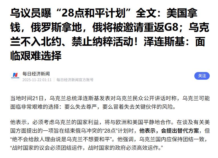 乌议员曝“28点和平计划”:美国拿钱,俄罗斯拿地,俄将被邀请重返G8;乌克兰不入北约、禁止纳粹活动! 泽连斯基已经初步给出回应,绝不接受有损乌克兰尊严和主权的和平协议。可以说初步拒绝了这个“28点计划”。 特朗普是真的想协调停战,他看得很透,也在多次场合直白地对泽连斯基说,你手上没有牌。言外之意你没有话语权,连上谈判桌的资格都没有。 然而泽连斯基的底线也很明确,绝对不能损害乌克兰的主权和领土。但问题是,你守得住吗,乌克兰国内百业凋敝,连居民生活用电都保证不了。国际援助已达数千亿美元,地主家的余粮也不多了,什么时候是个头。 特朗普也说了,“28点计划”不是最后通牒,泽连斯基可以选择继续战斗。 但没有外援的乌克兰,根本挡不住全线压上的俄军,结局可能会更糟。