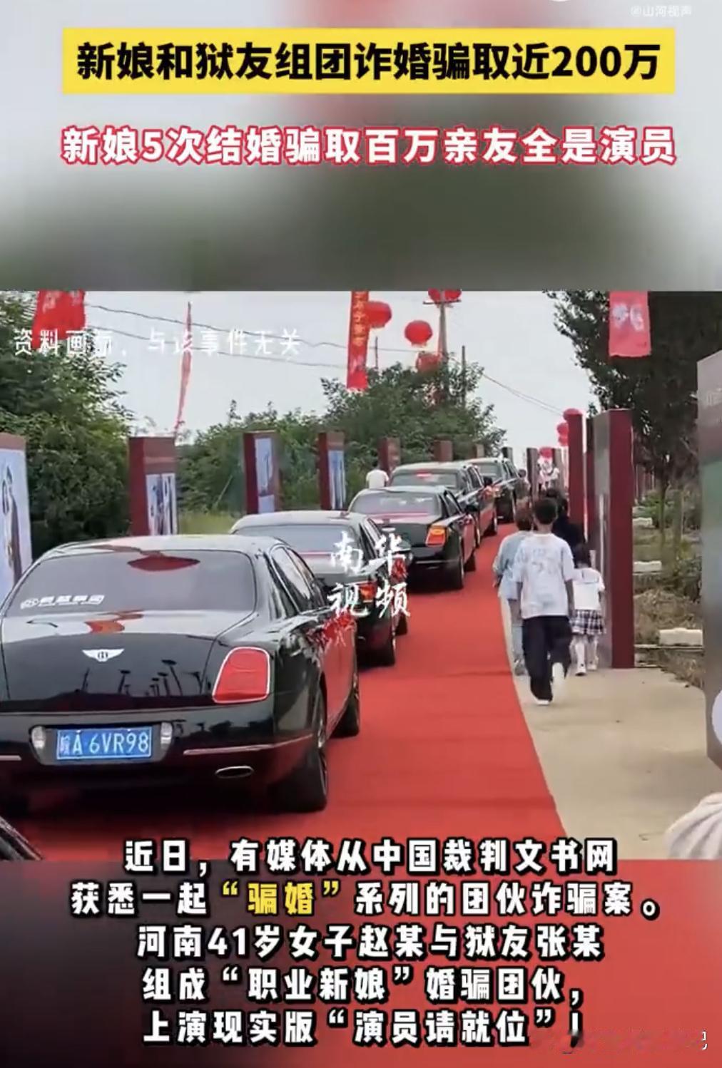 人生如戏,全靠演技,但骗来的“彩礼”终究换不来幸福,只换来13年铁窗泪。 最近河南一起婚骗案刷新三观:41岁的赵某和狱友张某组团“结婚”,5次“出嫁”骗了177万!婚礼上,从新娘到亲妈、舅舅、嫂子,全是花钱雇的演员。更绝的是,主犯赵某此前因诈骗坐过5次牢,张某也蹲过3次监狱,两人狱中相识,出狱后直接搭台唱戏,把婚姻变成“杀猪盘”。 有受害男子为结婚砸了30多万,结果婚后发现“妻子”对家庭冷淡,所谓“亲戚”全都失联,这才报警揭穿骗局。法院最后判赵某13年11个月,张某10年9个月,其他“演员”也纷纷领刑。 这年头,连结婚都得防“剧组”!骗子们分工明确:有人扮新娘,有人演丈母娘,还有人负责收钱谢幕。专挑急着成家的老实人下手,彩礼、订婚钱、礼金一条龙收割。要说这团伙也是“敬业”,连婚礼酒席的47900元都没放过,堪称“全流程诈骗”。 看明白了吗?我再给各位总结下: 骗局共性:瞄准大龄单身群体,利用婚姻焦虑快速索财,得手后立即消失。 防骗关键:婚前务必核实对方身份背景,别被“温柔贤惠”冲昏头;涉及大额彩礼时,多问几个为什么。 法律底线:诈骗终将入狱,莫把人生演成“监狱风云”! 你身边有遇到过类似“套路”吗?评论区分享你的见闻,点个赞关注我,防骗干货不迷路!