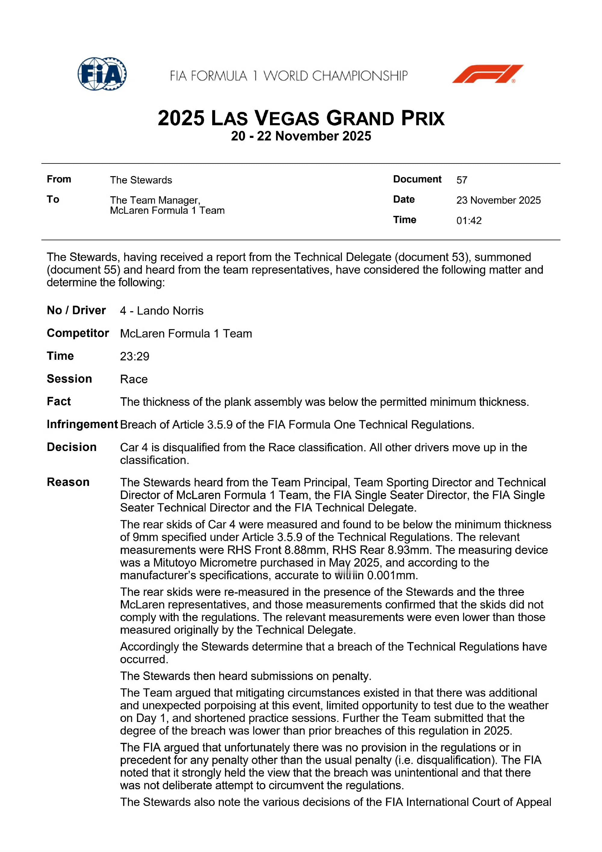 【Breaking News】官方:迈凯伦双车被取消成绩!!!诺里斯赛车的底板磨损剩余均为右前侧8.88毫米,右后侧8.93毫米。皮亚斯特里的底板磨损剩余均为右前侧8.74毫米,右前侧8.96毫米,右后侧8.90毫米。而规则规定任何地方不得低于9毫米。迈凯伦车队辩称:由于练习赛红旗和天气原因,车队没有经过长距离测试。且违规的程度明显低于此前其他车队。FIA认为,无论是在规则中还是在先例中,都没有规定除了通常的处罚(DSQ)之外的任何其他处罚措施。FIA强烈认为这一违规行为并非故意,且不存在蓄意试图规避规则的行为。