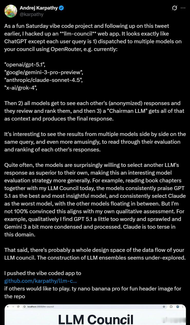 AI大神卡帕西又整活了,这次把大模型拉进了“议会系统”互相开会评判彼此——他新做了一个llm-council项目,是一个开源web应用,底层是多个模型串联合作的“多模态委员会”机制:- 用户提问后,问题会被同步发送给多个大模型,比如GPT-5.1、Gemini 3 Pro、Claude Sonnet 4.5和Grok-4;- 每个模型单独答一遍,再看到其他模型的回答进行匿名互评、打分、写点评;- 最后由“主席模型”整合大家的答案和评价,生成最终答复。最有趣的部分就是模型彼此互评时居然挺“诚实”,它们很乐意承认别的模型写得比自己好,甚至不乏批评自己答得不如人意的情况。卡帕西还拿这个“议会”一起读书做实验,观察哪家模型更擅长分析文本,结果显示GPT-5.1经常被大家评为最佳,而Claude总是垫底,但他个人认为Gemini 3其实更凝练,GPT-5.1太啰嗦了。这个项目探索了一个新方向:多模型“集体智慧”,不再只靠一个大模型闭门造车,而是让它们互相反馈、竞合、择优生成。更大胆的想法是,也许未来的AI系统不是一个模型,而是多个模型组成的团队,每个都有分工,互相投票、互相审校。项目目前已开源,感兴趣的朋友可以从这里玩起来:github.com/karpathy/llm-council