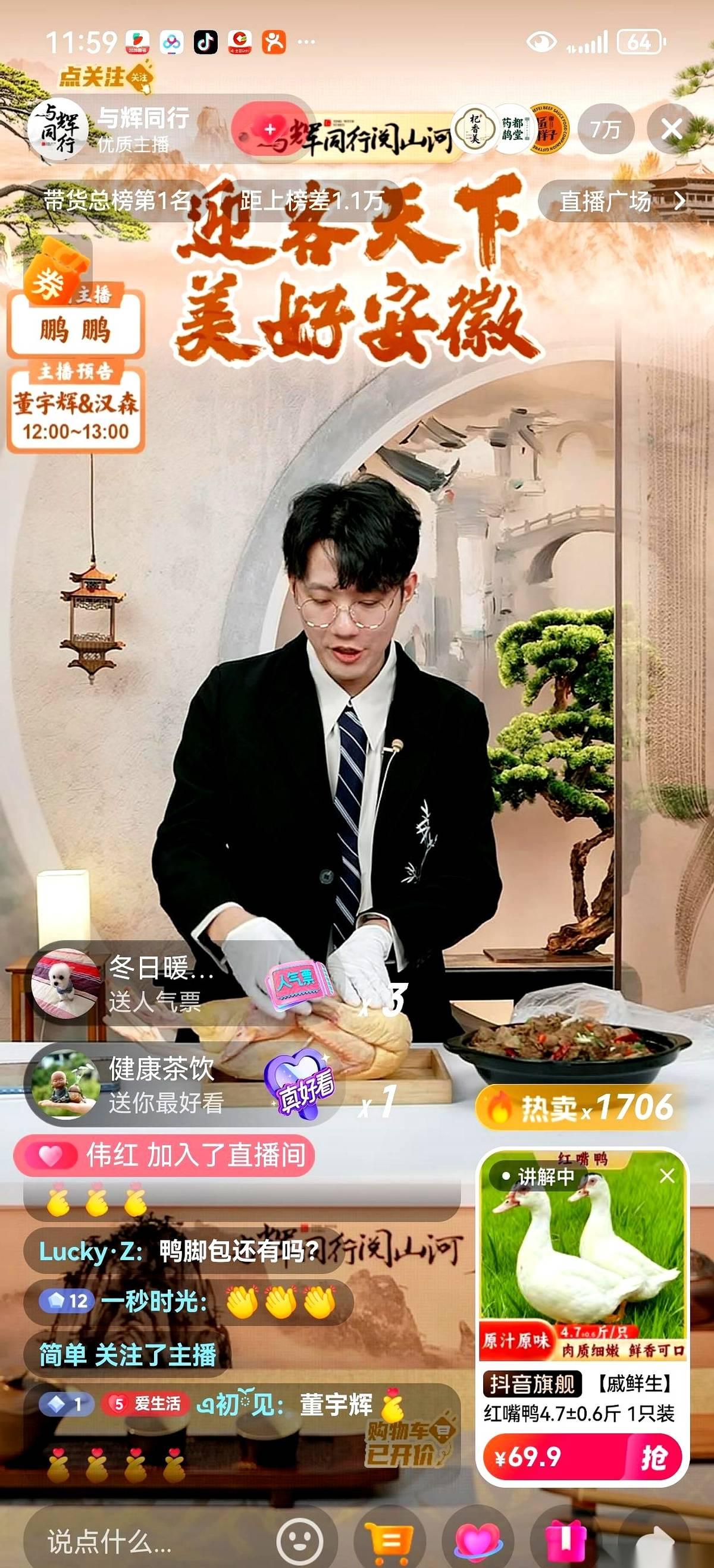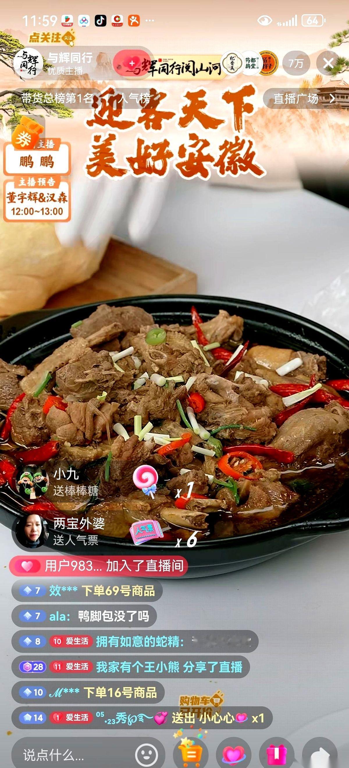 我这心啊,一直揪着。 真的,就跟送孩子去高考一模一样。 生怕我们家东西不好,生怕人家不喜欢,生怕宇辉这次回来,场面不够好看。 你懂那种感觉吗? 就是那种,明明知道自己家孩子挺好的,朴实,实在,但就是没见过大世面,有点拿不出手。 手心全是汗,一遍遍刷那个小黄车。 然后,我看到了。 符离鸡,售罄。 鸭脚包,售罄。 黄山烧饼,售罄! 好家伙,我那口气一出来,眼泪差点跟着下来。 真的不是说卖了多少钱的事儿。 是一种……“被看见”的感觉。 是我们那个不怎么会吆喝,有点“土”的家,被那么多人真心实意地捧在手心里的感觉。 那份骄傲,是打心底里涌出来的。 谢谢你们啊,真的。 谢谢你们喜欢我的家。
