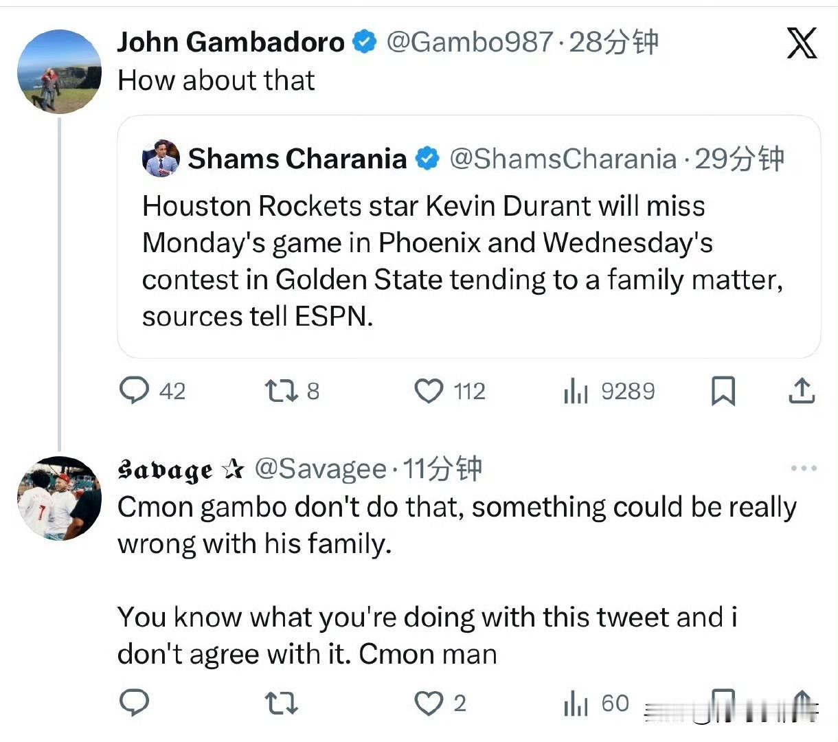 杜兰特请假了!!!因处理家庭事务,杜兰特将缺席接下来的两场比赛! 根据记者Shams最新消息透露,火箭超级球星杜兰特因为需要处理一些自己家庭的事情,他将缺席接下来的两场比赛。 杜兰特请假的时候不多吧,目前具体事情尚未公布,未来火箭的两场比赛对手分别是太阳和勇士,而且都是客场比赛,这对火箭压力还是不小的,火箭不敢说一定能赢这两支球队。 不过杜兰特缺阵比赛一事又被太阳当地的主持人Gambo阴阳起来了,他直接转发杜兰特缺阵消息并说道,这是什么情况? 太阳摄影师也是直接回复他,你不要这样好不好,人家可能家里真的有什么事情,你现在这么说是什么意思,安的什么心?我可不赞同你这么干。 看来太阳当地还是有些人对杜兰特很不满的,但是杜兰特离开太阳又不是他主动要走的,是太阳管理层选择率先交易他的,不应该怪杜兰特吧。 杜兰特 凯文杜兰特 凯文-杜兰特 火箭