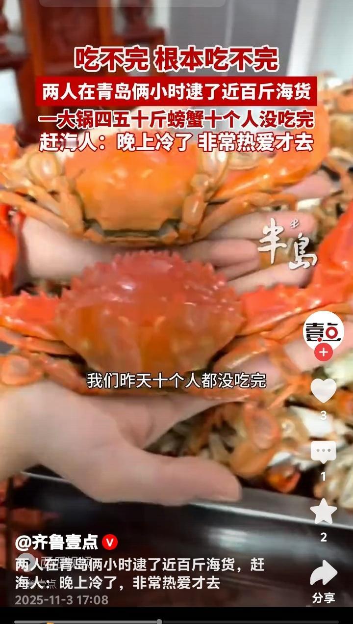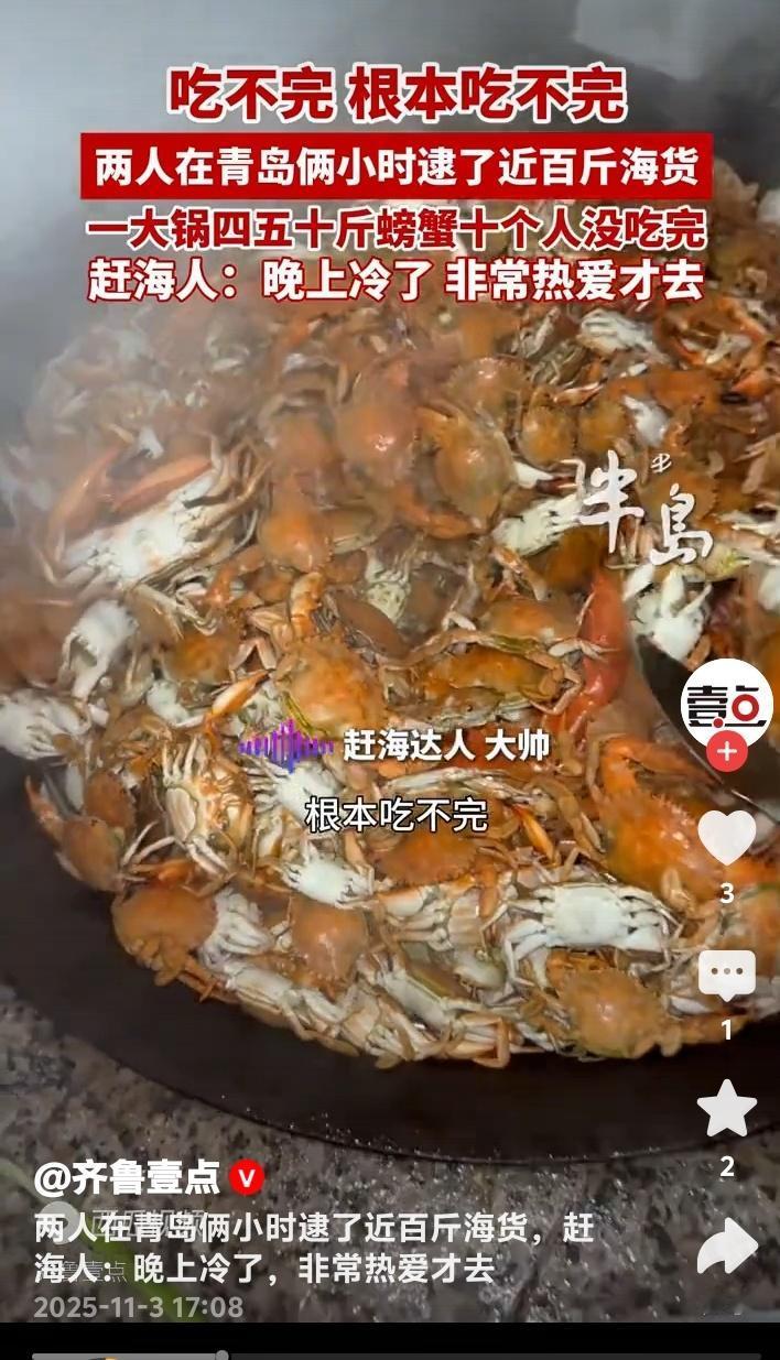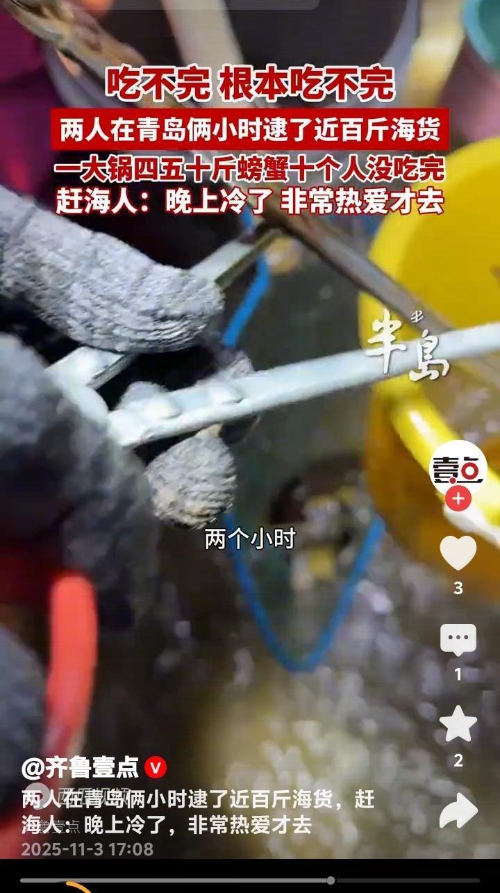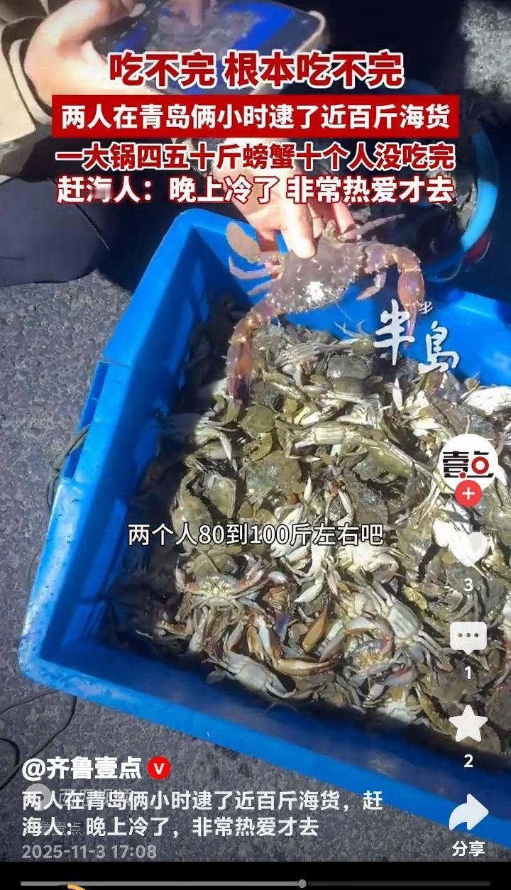 青岛即墨惊现海鲜奇迹!两人两小时狂捞近百斤螃蟹堆成小山十人根本吃不完 初冬的青岛即墨海滩正在上演现实版“海鲜自由”。两位赶海爱好者(其中一位网名大帅)趁着夜色,在退潮的短短两小时内竟收获近百斤肥美螃蟹,装满农家烧坑大灶的铁锅堆成小山,十个人围坐畅吃都未能消灭这份来自大海的馈赠。 这场惊人的收获发生在11月2日的即墨海域。当晚正值大潮,两位资深赶海人带着专业工具来到这片富饶的滩涂。他们透露,由于近日天气突然回温,大量螃蟹滞留在浅水区,这才创造了如此罕见的丰收奇迹。 当满载而归的赶海人将战利品倒入直径一米的大铁锅时,连见多识广的当地村民都惊呆了。青壳白肚的螃蟹在锅中堆积如山,每只都个头饱满、蟹黄充盈。这样壮观的场面让人瞬间理解了什么叫做“海鲜盛宴”。 参与当晚聚餐的食客回忆,大家从晚上七点一直吃到深夜,蒸螃蟹、炒蟹块、蟹黄拌面轮番上阵,最后还是剩下大半锅。这种“甜蜜的负担”让在场所有人都感受到了大海的慷慨馈赠。 这两位创造奇迹的赶海人大帅表示,尽管夜晚的海水已经透凉,但对赶海的热爱支撑着他们持续探索。他们熟悉每一片礁石的特性,能准确判断潮汐的节奏,这些经验积累才是收获的关键。 专家解释,近期青岛海域出现的异常回暖现象,确实会导致海洋生物活动规律改变。螃蟹等甲壳类动物对水温变化极为敏感,突然升温会让它们主动向浅水区聚集,这就为赶海人创造了绝佳时机。 这则新闻在社交媒体引爆热议。有网友羡慕地表示“这简直就是现实版《老人与海》”,也有人调侃“终于知道为什么超市螃蟹涨价了”。更多人则被这种亲近自然的生活方式所吸引,计划着周末也要去海边试试运气。 不过海洋专家也提醒,虽然赶海乐趣无穷,但必须注意安全。要提前了解潮汐时间,穿戴专业防护装备,切勿单独行动。同时要遵守当地渔业规定,保护海洋生态平衡,让这份大自然的馈赠能够持续传承。 这场即墨海滩的奇迹收获,不仅展现了海洋的丰饶,更唤起了都市人对质朴生活的向往。当我们在城市中奔波时,还有这样一群人保持着与大海的亲密对话,这种生活方式本身就很治愈。 (来源:齐鲁壹点现场采访及赶海爱好者实地走访)
