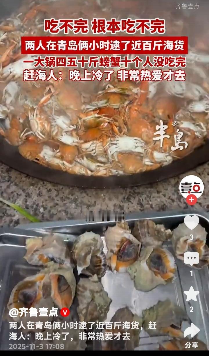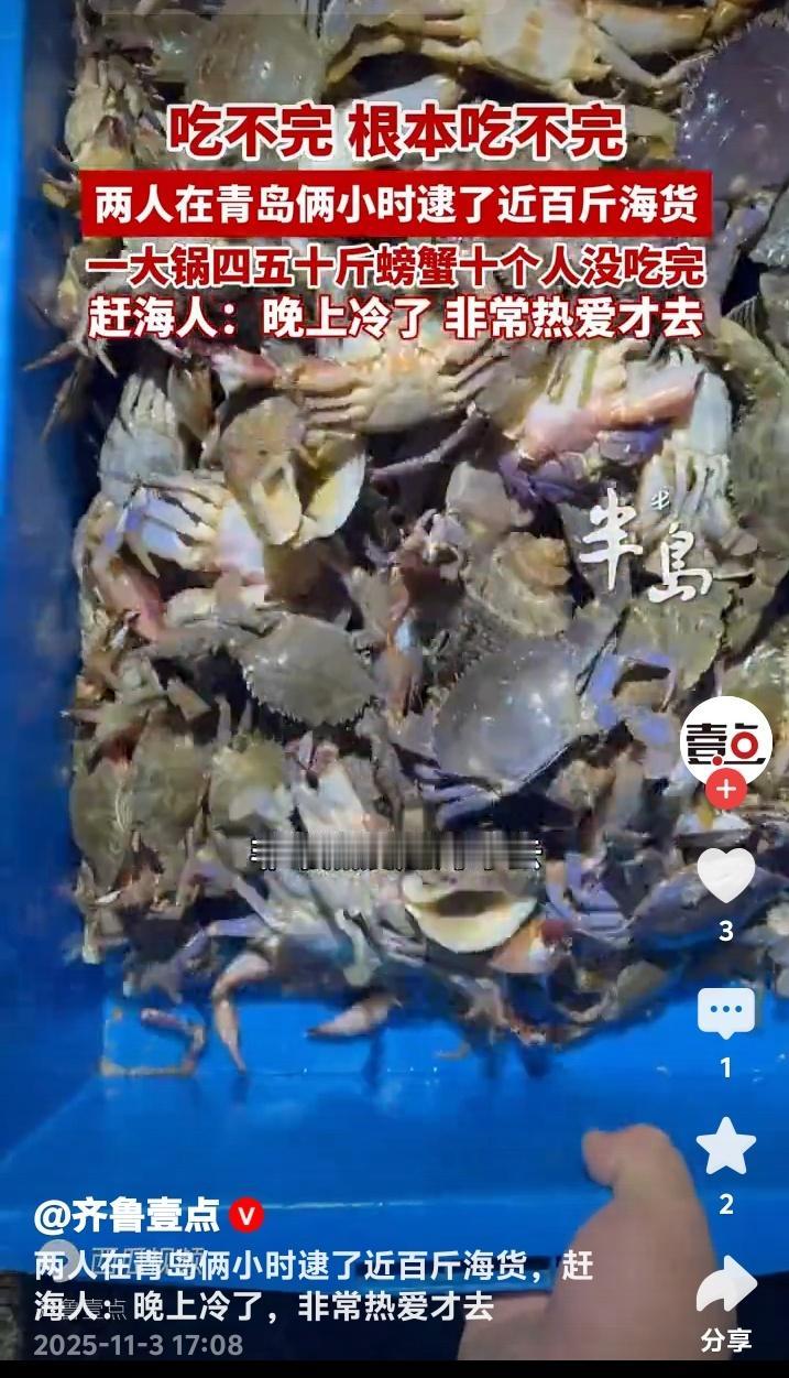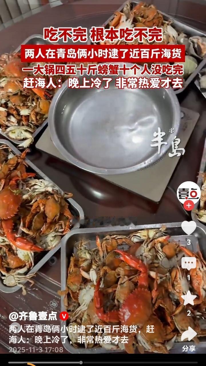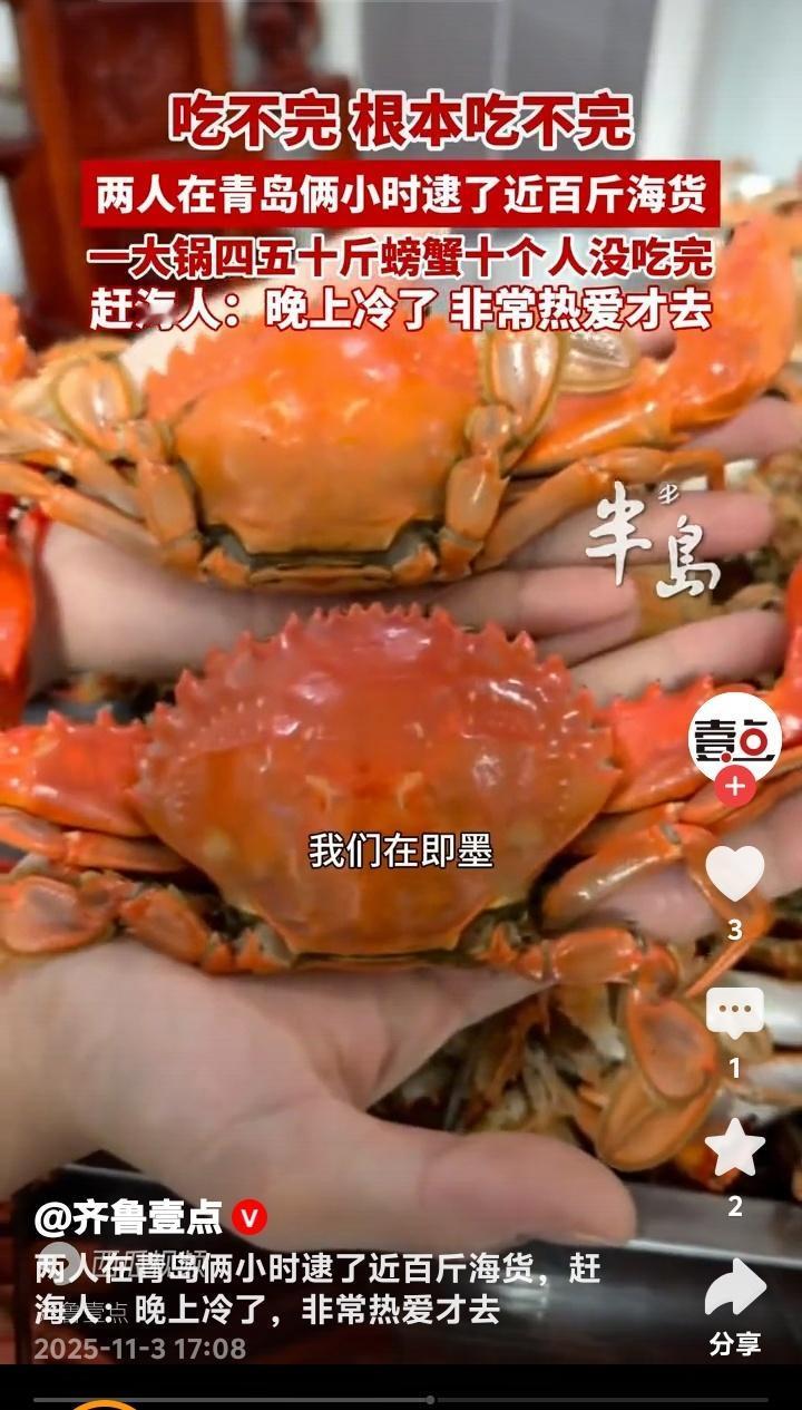 青岛即墨惊现海鲜奇迹!两人两小时狂捞近百斤螃蟹堆成小山十人根本吃不完 初冬的青岛即墨海滩正在上演现实版“海鲜自由”。两位赶海爱好者(其中一位网名大帅)趁着夜色,在退潮的短短两小时内竟收获近百斤肥美螃蟹,装满农家烧坑大灶的铁锅堆成小山,十个人围坐畅吃都未能消灭这份来自大海的馈赠。 这场惊人的收获发生在11月2日的即墨海域。当晚正值大潮,两位资深赶海人带着专业工具来到这片富饶的滩涂。他们透露,由于近日天气突然回温,大量螃蟹滞留在浅水区,这才创造了如此罕见的丰收奇迹。 当满载而归的赶海人将战利品倒入直径一米的大铁锅时,连见多识广的当地村民都惊呆了。青壳白肚的螃蟹在锅中堆积如山,每只都个头饱满、蟹黄充盈。这样壮观的场面让人瞬间理解了什么叫做“海鲜盛宴”。 参与当晚聚餐的食客回忆,大家从晚上七点一直吃到深夜,蒸螃蟹、炒蟹块、蟹黄拌面轮番上阵,最后还是剩下大半锅。这种“甜蜜的负担”让在场所有人都感受到了大海的慷慨馈赠。 这两位创造奇迹的赶海人大帅表示,尽管夜晚的海水已经透凉,但对赶海的热爱支撑着他们持续探索。他们熟悉每一片礁石的特性,能准确判断潮汐的节奏,这些经验积累才是收获的关键。 专家解释,近期青岛海域出现的异常回暖现象,确实会导致海洋生物活动规律改变。螃蟹等甲壳类动物对水温变化极为敏感,突然升温会让它们主动向浅水区聚集,这就为赶海人创造了绝佳时机。 这则新闻在社交媒体引爆热议。有网友羡慕地表示“这简直就是现实版《老人与海》”,也有人调侃“终于知道为什么超市螃蟹涨价了”。更多人则被这种亲近自然的生活方式所吸引,计划着周末也要去海边试试运气。 不过海洋专家也提醒,虽然赶海乐趣无穷,但必须注意安全。要提前了解潮汐时间,穿戴专业防护装备,切勿单独行动。同时要遵守当地渔业规定,保护海洋生态平衡,让这份大自然的馈赠能够持续传承。 这场即墨海滩的奇迹收获,不仅展现了海洋的丰饶,更唤起了都市人对质朴生活的向往。当我们在城市中奔波时,还有这样一群人保持着与大海的亲密对话,这种生活方式本身就很治愈。 (来源:齐鲁壹点现场采访及赶海爱好者实地走访)