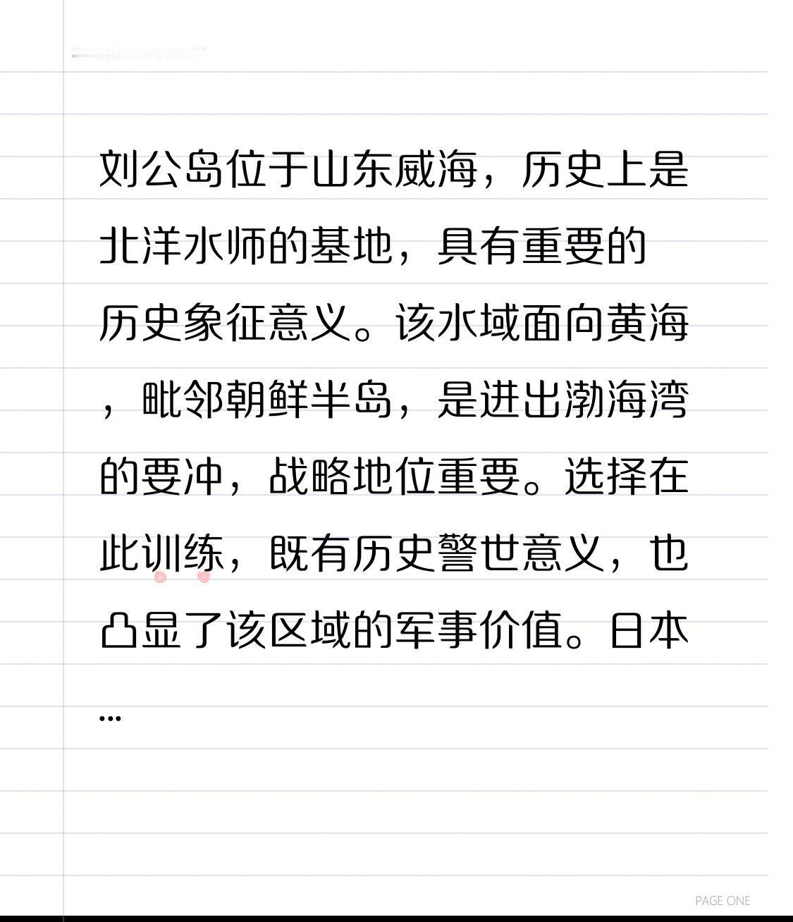 刘公岛位于山东威海,历史上是北洋水师的基地,具有重要的历史象征意义。该水域面向黄海,毗邻朝鲜半岛,是进出渤海湾的要冲,战略地位重要。选择在此训练,既有历史警世意义,也凸显了该区域的军事价值。 日本可能以此为由,宣布在未来几天或几周内,在冲绳附近或日本海区域举行相应的军事演习作为回应。双方在东海海空域的近距离对峙频率和危险性可能增加,发生意外事件的风险上升。外交层面的互相指责会升级,可能影响到其他领域的合作。