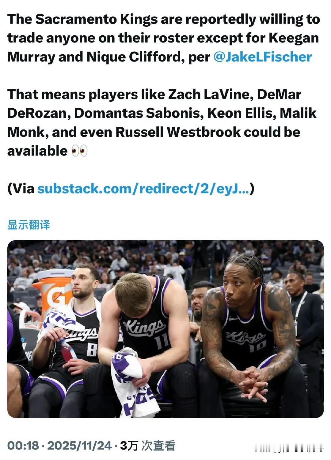 国王正式进入重建!!!除基根-穆雷和克利福德,国王其他球员均可被交易! 根据记者Jake Fischer最新消息透露,国王队的交易市场真的要打开了,目前除了基根-穆雷和尼克-克利福德这两个家伙,国王可以交易其他所有球员,包括威少! 这也意味着国王又要开始重建了,虽然看上去他们一直在重建,不过前几年他们毕竟也有重回强队的征兆,但是好景不长,球队被他们自己给拆了。 这只能怪管理层的昏庸,尤其是把前公牛哼哈二将拉文和德罗赞一起搞过来,这不是就是公牛的翻版吗,公牛都已经证明这是失败的,他们就不信邪,当年公牛要交易拉文的决心有多大,如果没有国王的话,拉文现在不是被买断就是还在芝加哥打球呢,甩不掉的。 小萨和埃利斯是仅有的比较有价值的两名球员,蒙克交易问题也不大,威少的合同也不是全额保障,处理起来都比较容易。 威少潜在下家 国王新赛季 国王队阵容 国王队 威少 拉文